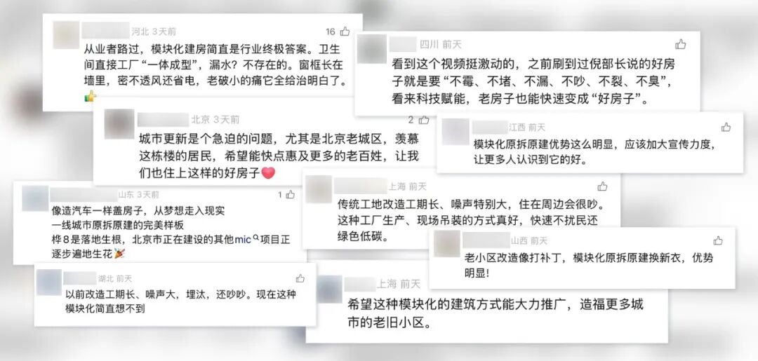 网友纷纷点赞建筑新科技:“模块化建房简直是行业终极答案。卫生间直接工厂‘一体成型’,漏水?不存在的。窗框长在墙里,密不透风还省电,老破小的痛它全给治明白了”“这种模式,百姓少折腾,周边影响小,把技术优势转化成了实实在在的民生体验,是城市更新该有的温度。”