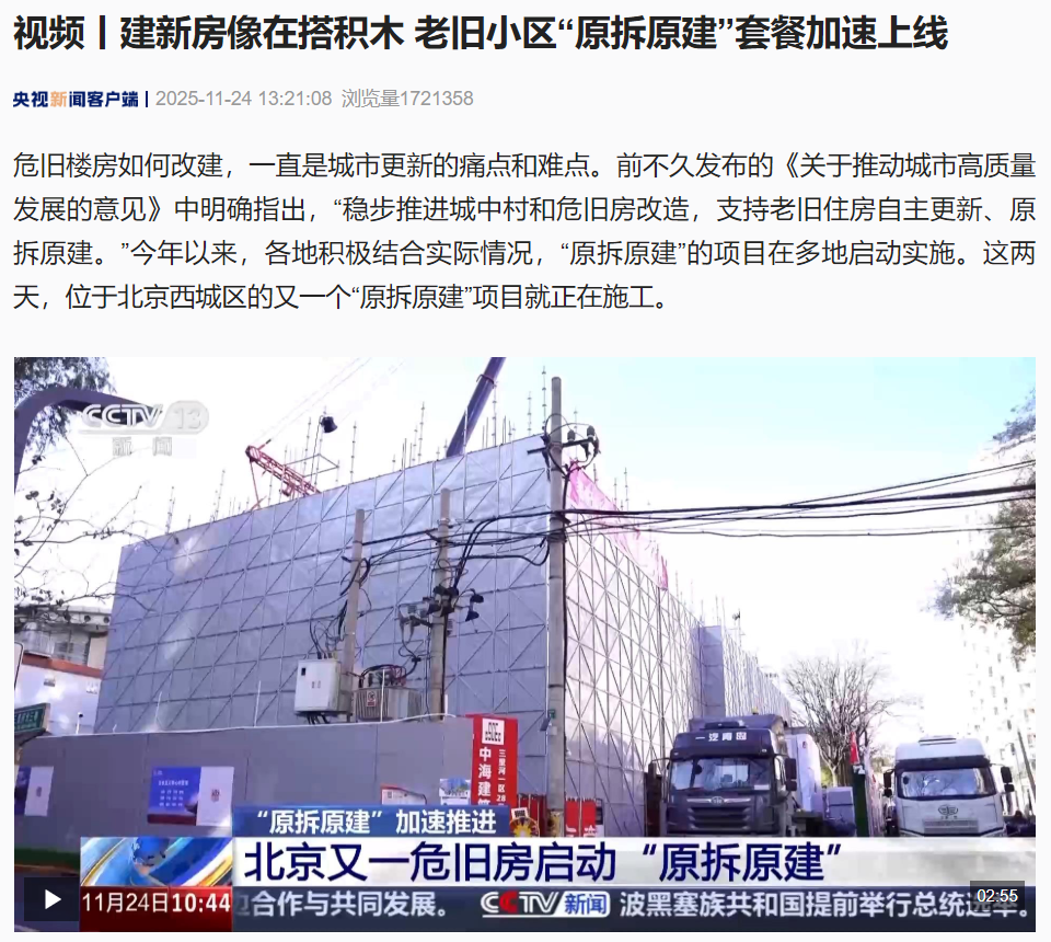 近年来,中国建筑国际在北京、上海等地实施老旧小区“原拆原建”项目,通过自主研发的模块化集成建筑技术完成改造焕新,助力居民早迁新居,得到中央广播电视总台多次报道,邀您回顾——