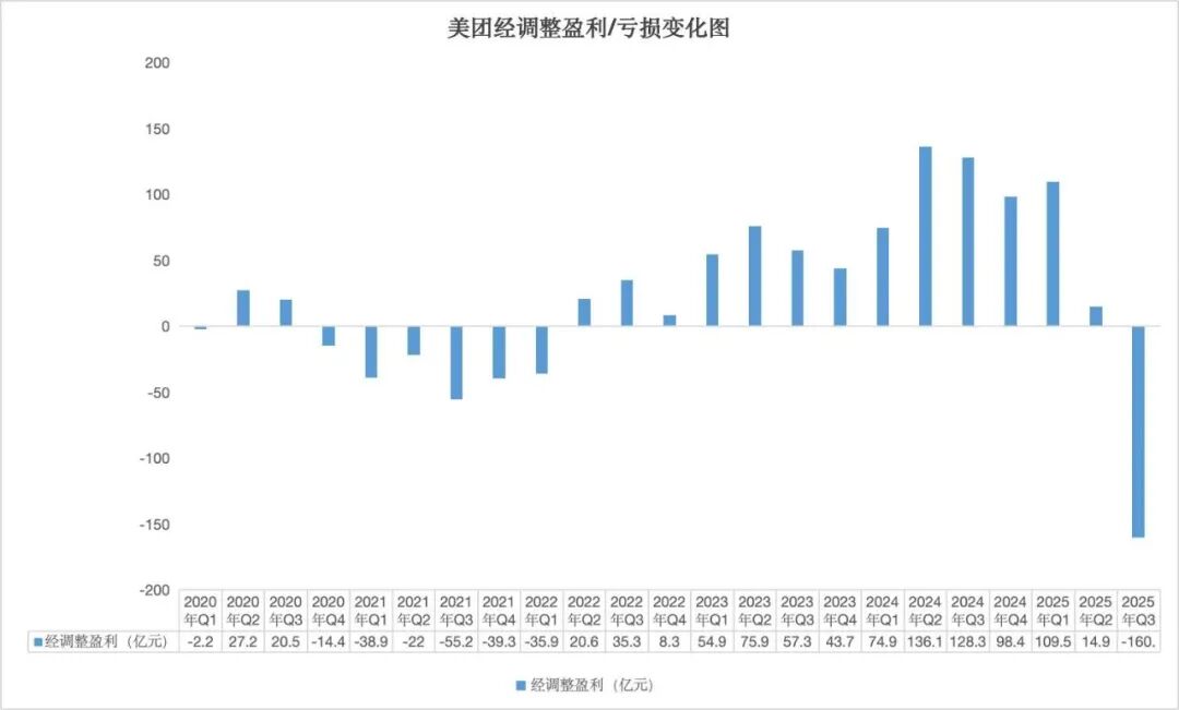 财报显示,第三季度,美团调整后的净亏损为160亿元,而2024年同期净利润为128亿元。这也是美团近年来亏损最为惨烈的一次。