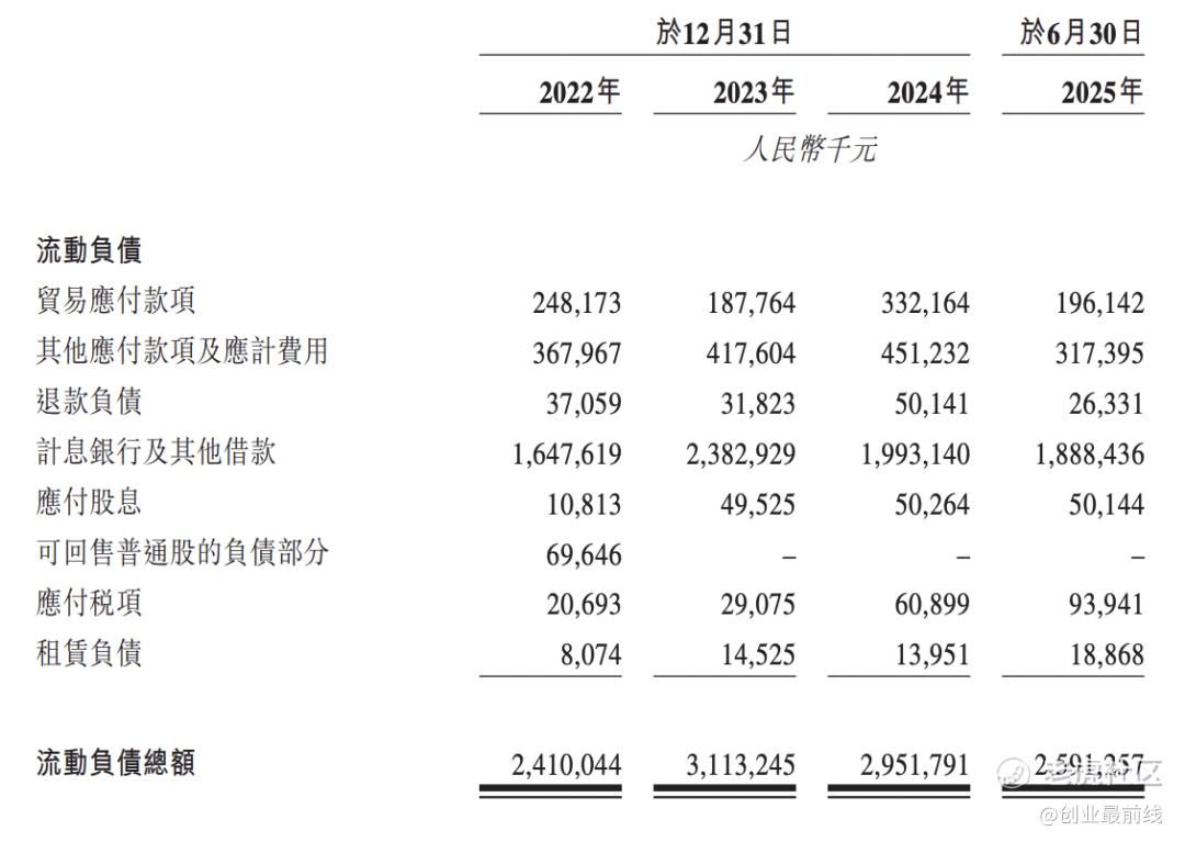 流动负债中,计息银行及其他借款占主导,2024年全年及2025年上半年分别为19.93亿元和18.88亿元,公司仍高度依赖短期融资维持运营。