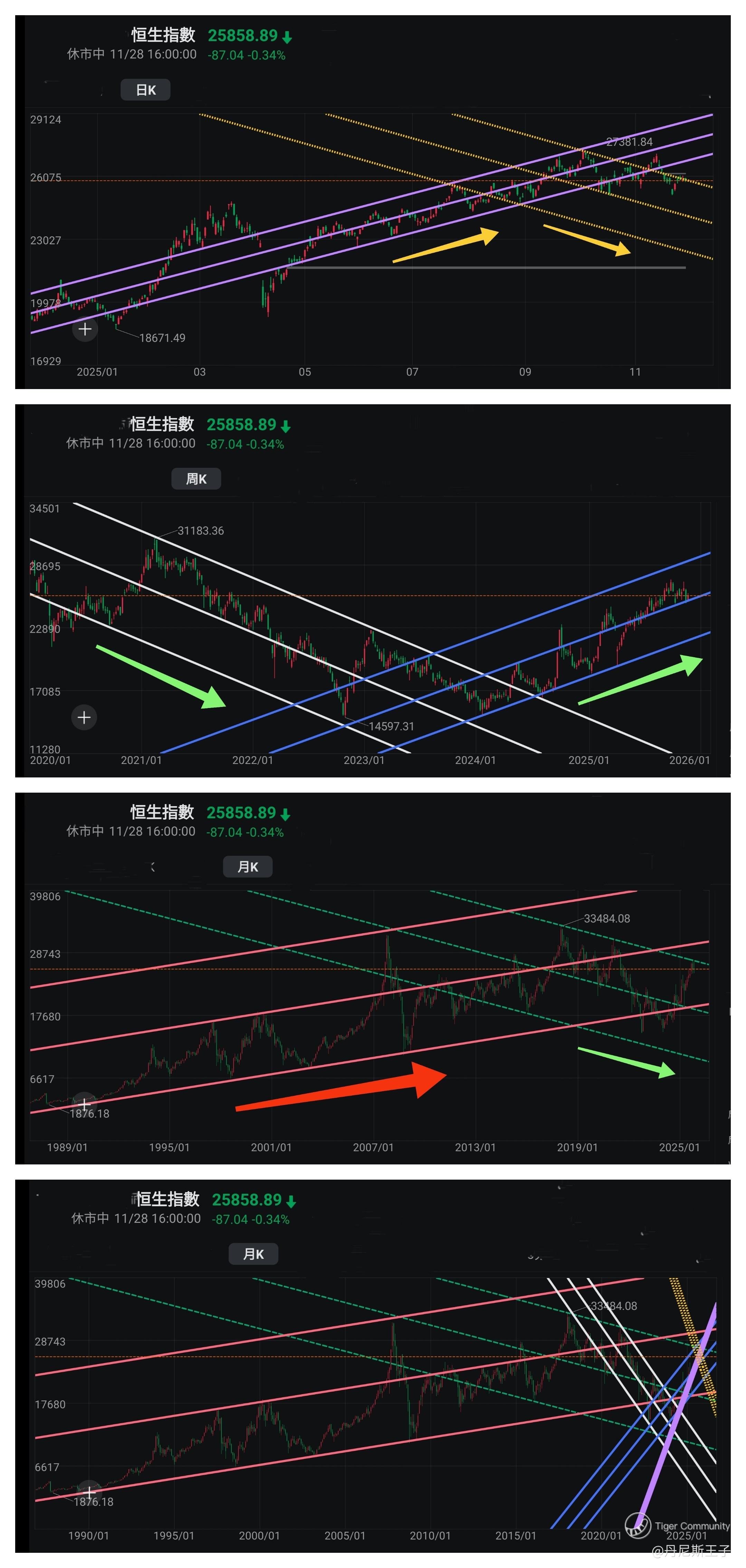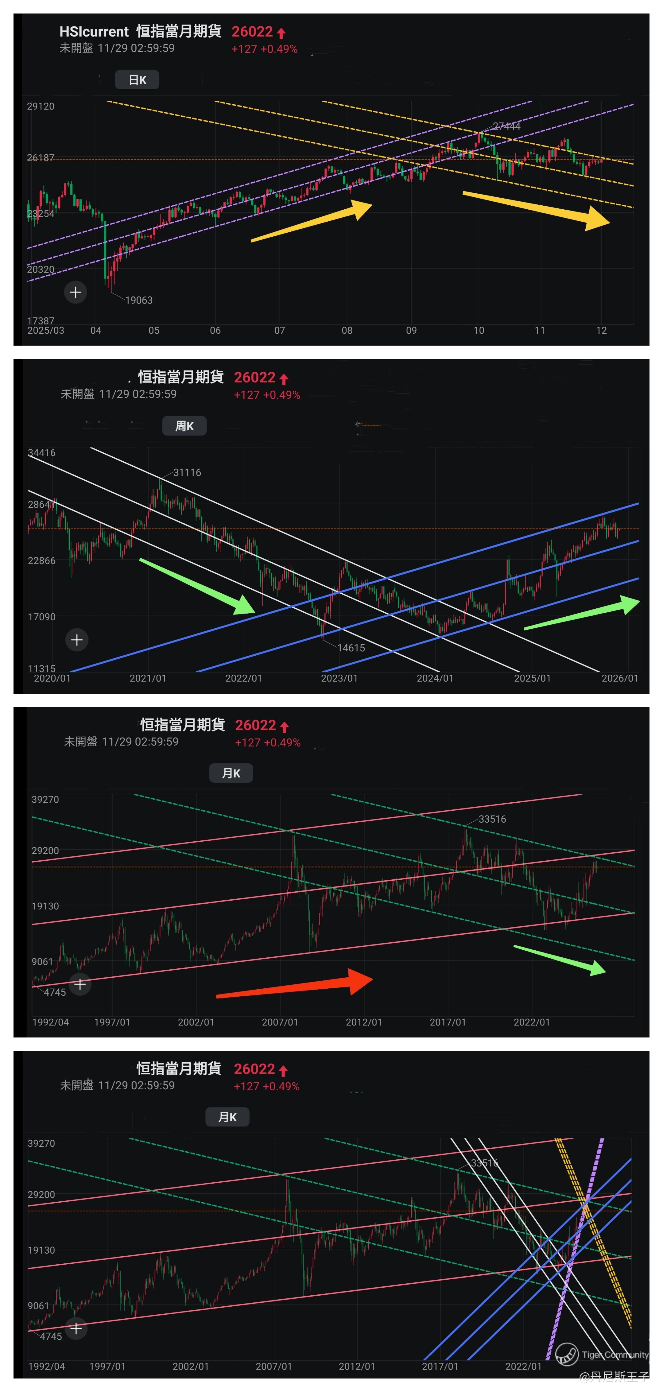 月线图: 恒生指数现正处于绿色通道线上轴之下,需观察往后时间能否升穿上轴还是向下回落。
