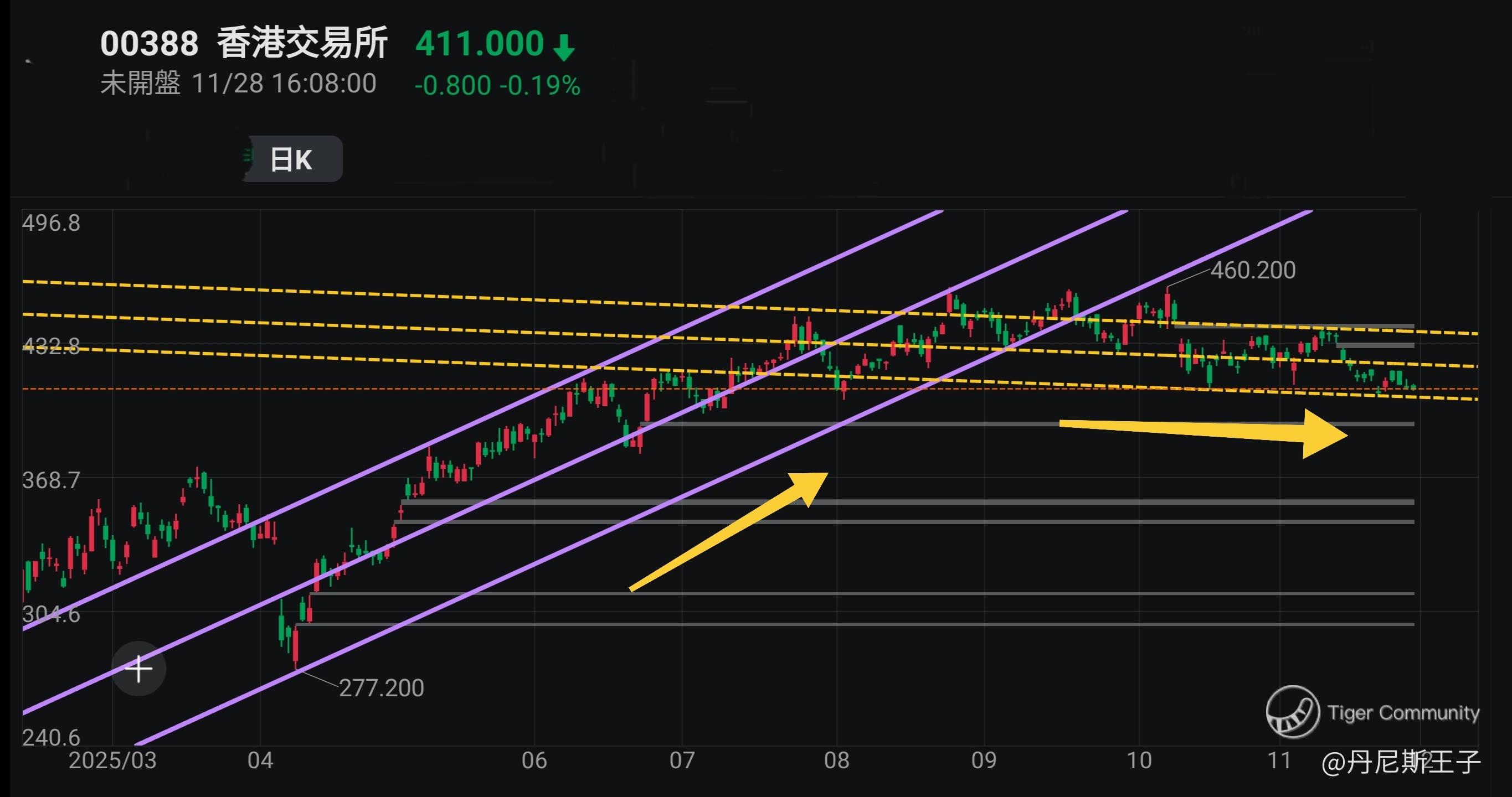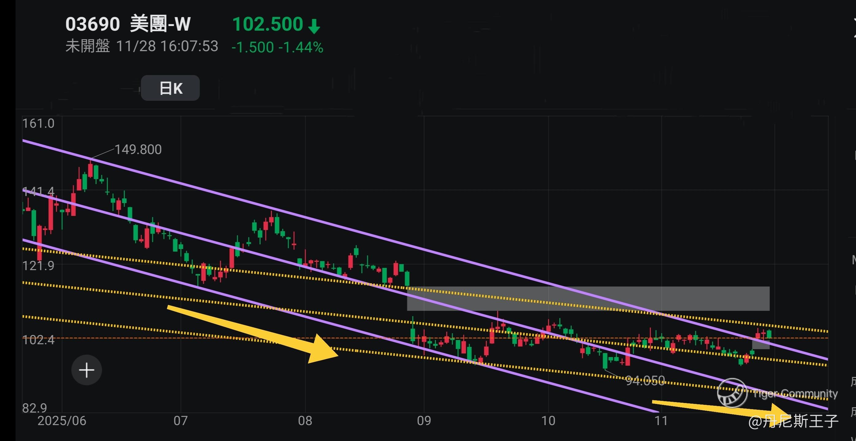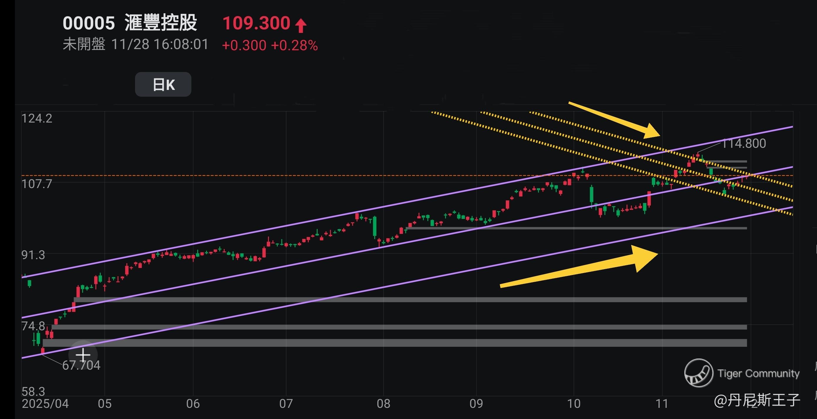 日线图:恒生指数现正处于黄色下降通道线的上轴之下,需观察往后时间能否升穿上轴并继续向上升还是向下回落。