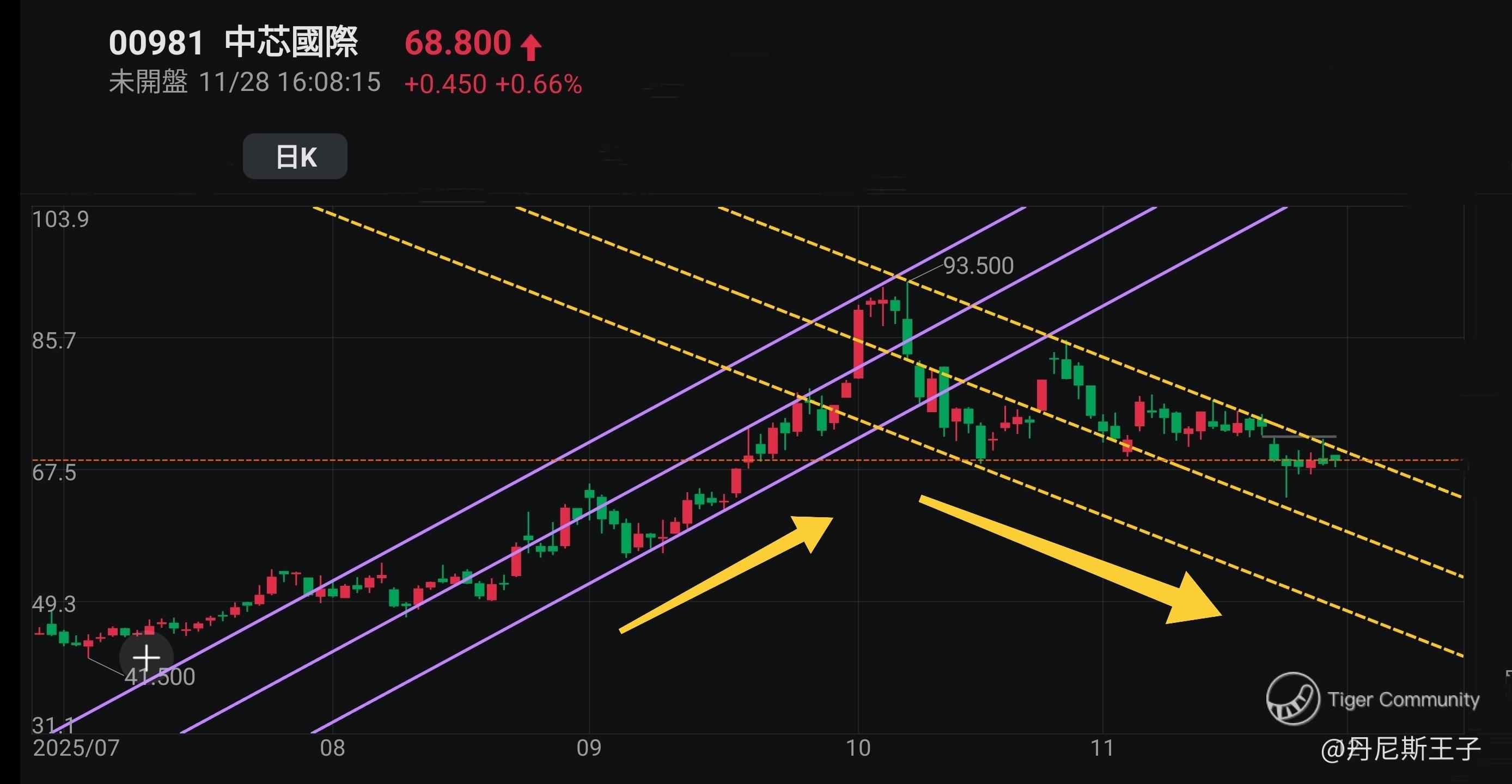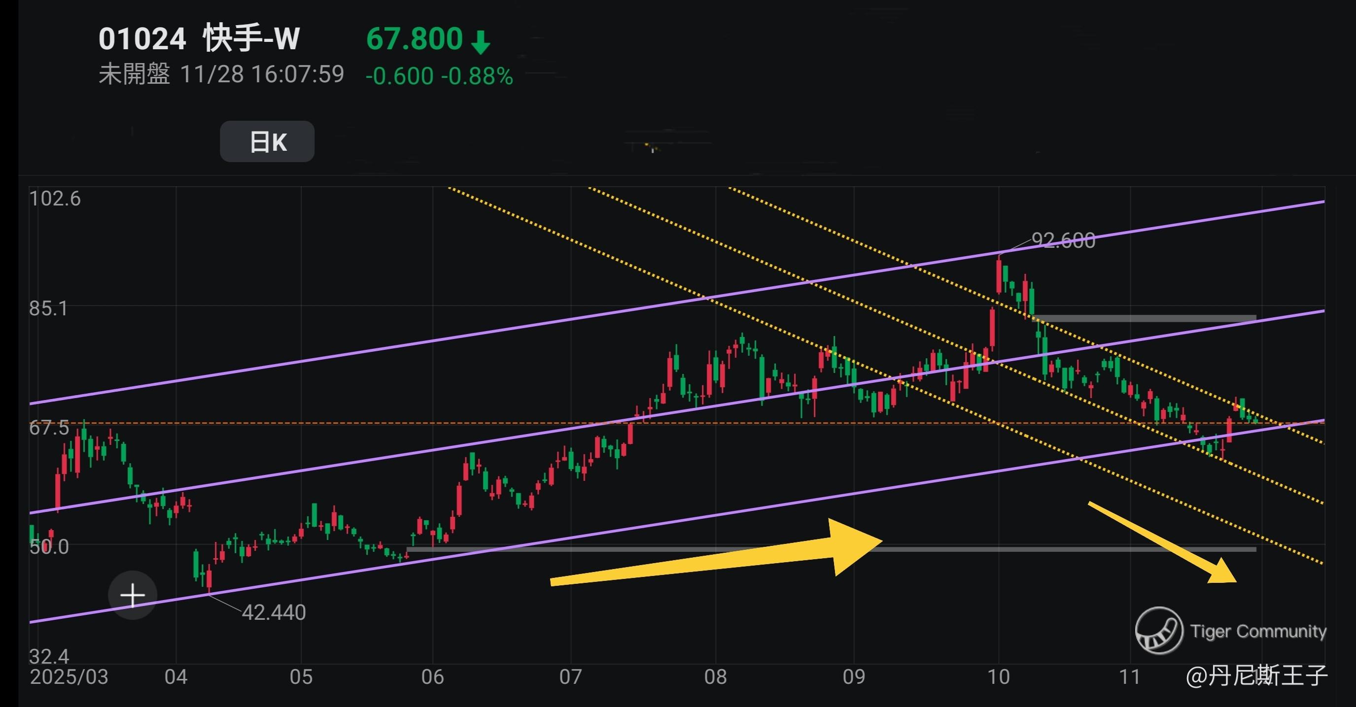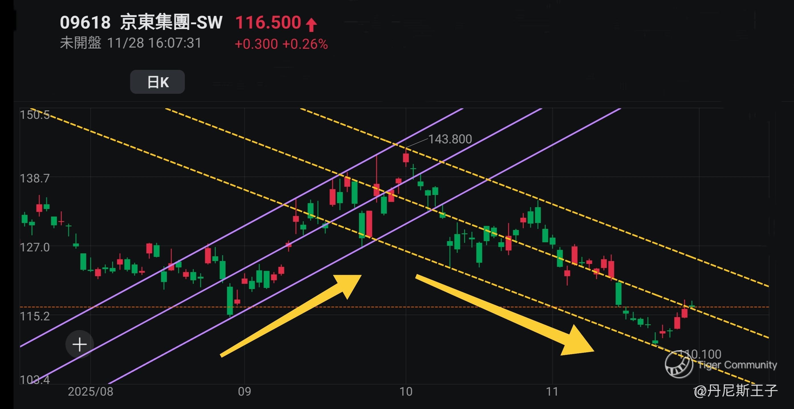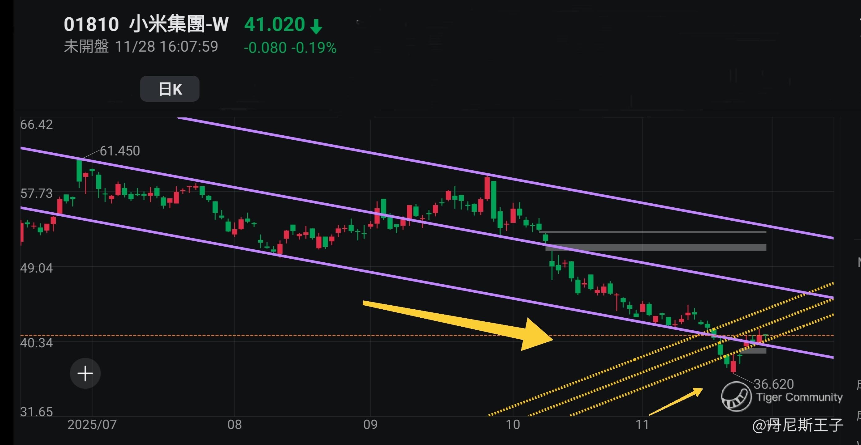 日线图:恒生指数现正处于黄色下降通道线的上轴之下,需观察往后时间能否升穿上轴并继续向上升还是向下回落。