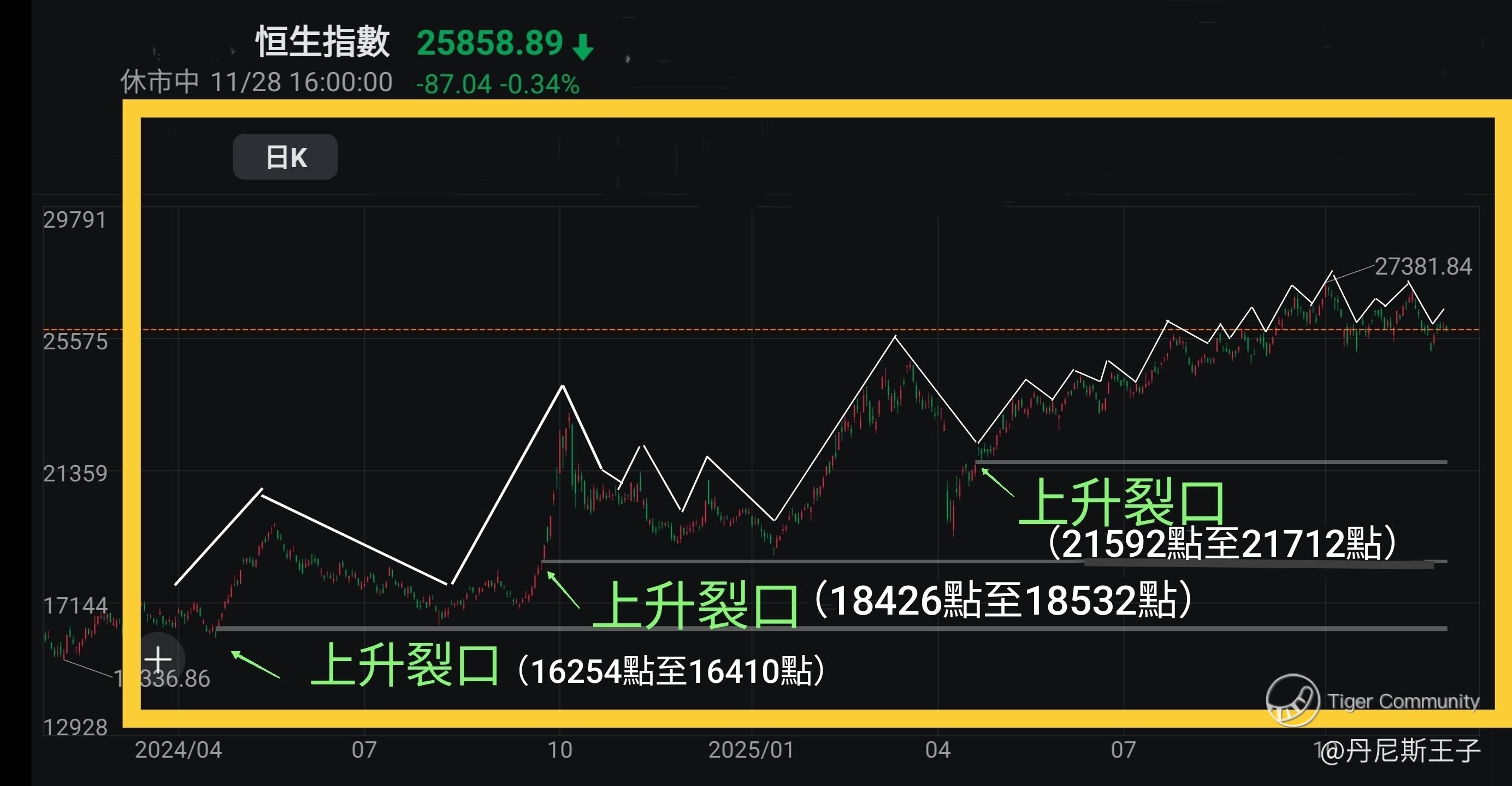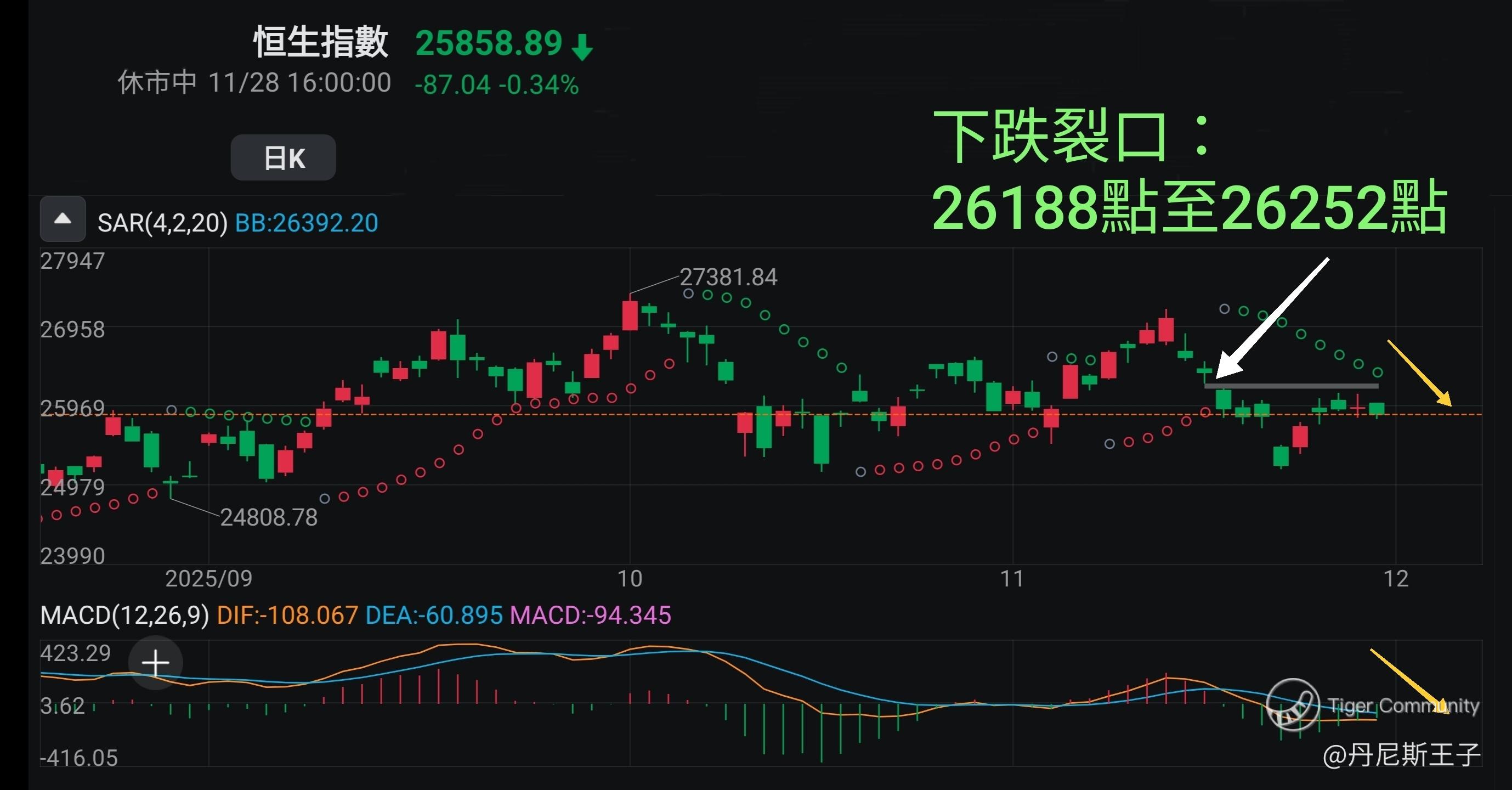 从下跌裂口图可看到中期指标SAR和MACD指标趋势向下,恒生指数一日未补回此下跌裂口这个阻力区,相信投资者都难有十足信心觉得指数会继续往上升。