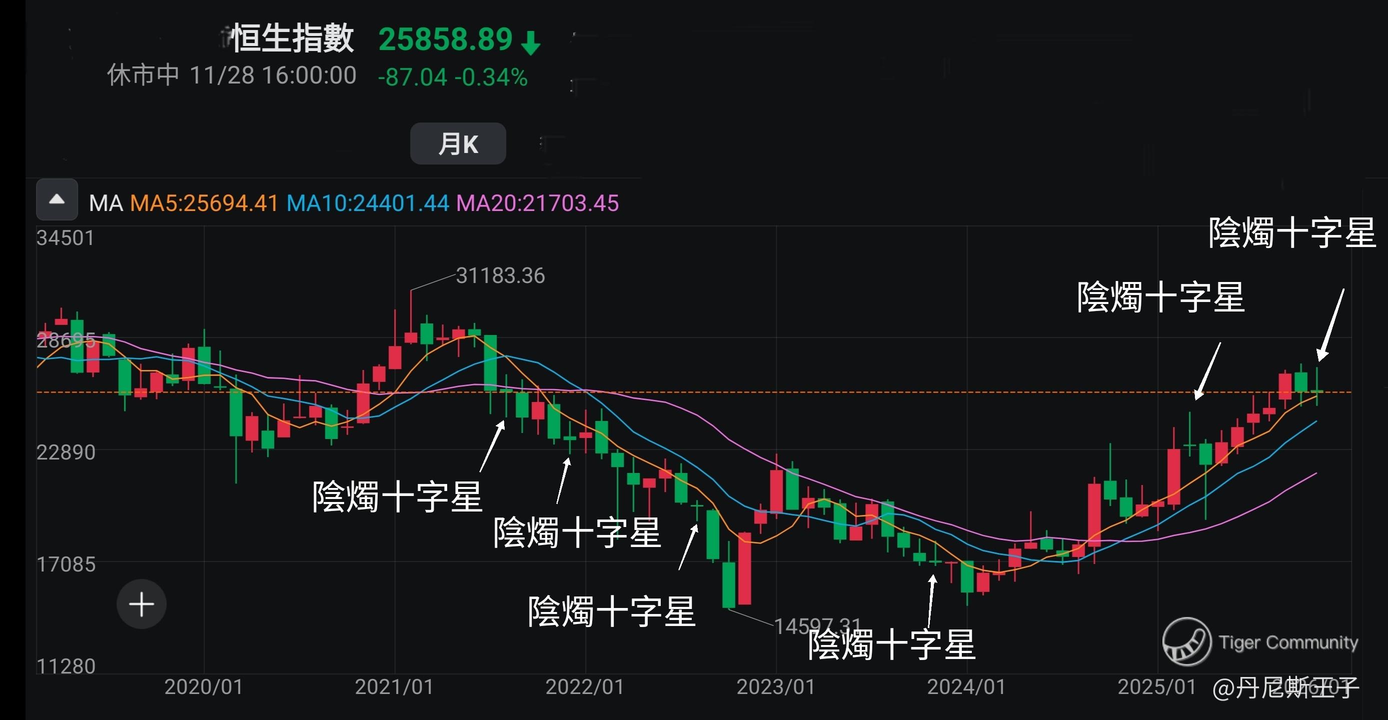 11月份过去,恒生指数处于(5,10,20)移动平均月线之上趋势向好,但从K线图可见,11月份恒生指数出现一支阴烛十字星,由于自2020年至今每逢出现阴烛十字星后的一个月是跌多升少,因此亦须提防12月份恒生指数会继续向下调整。