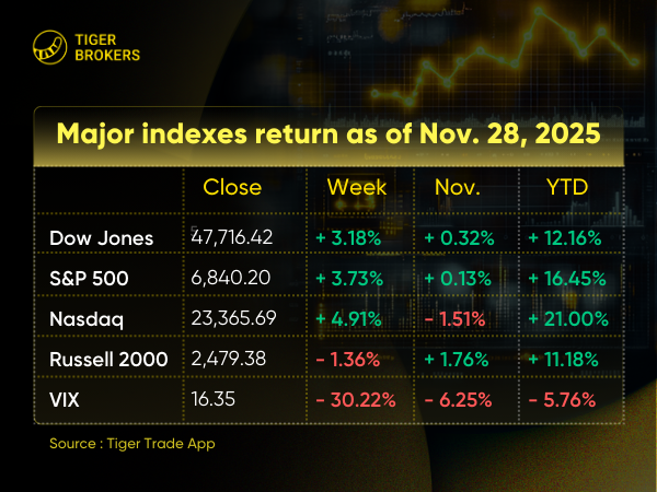 周报:美股迎自2008年来最强感恩节周行情,AI科技领涨,12月降息预期升温