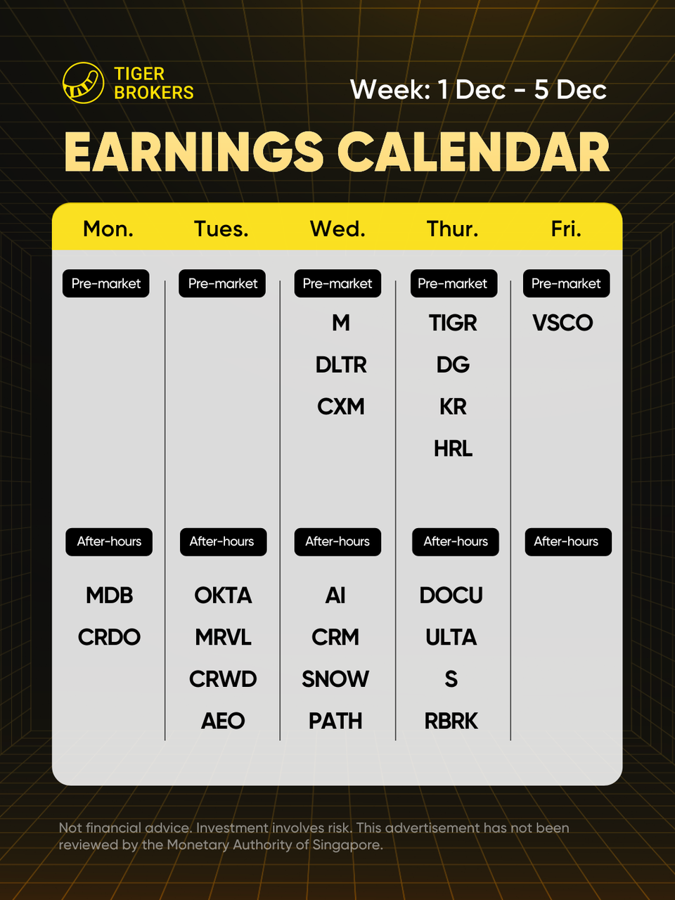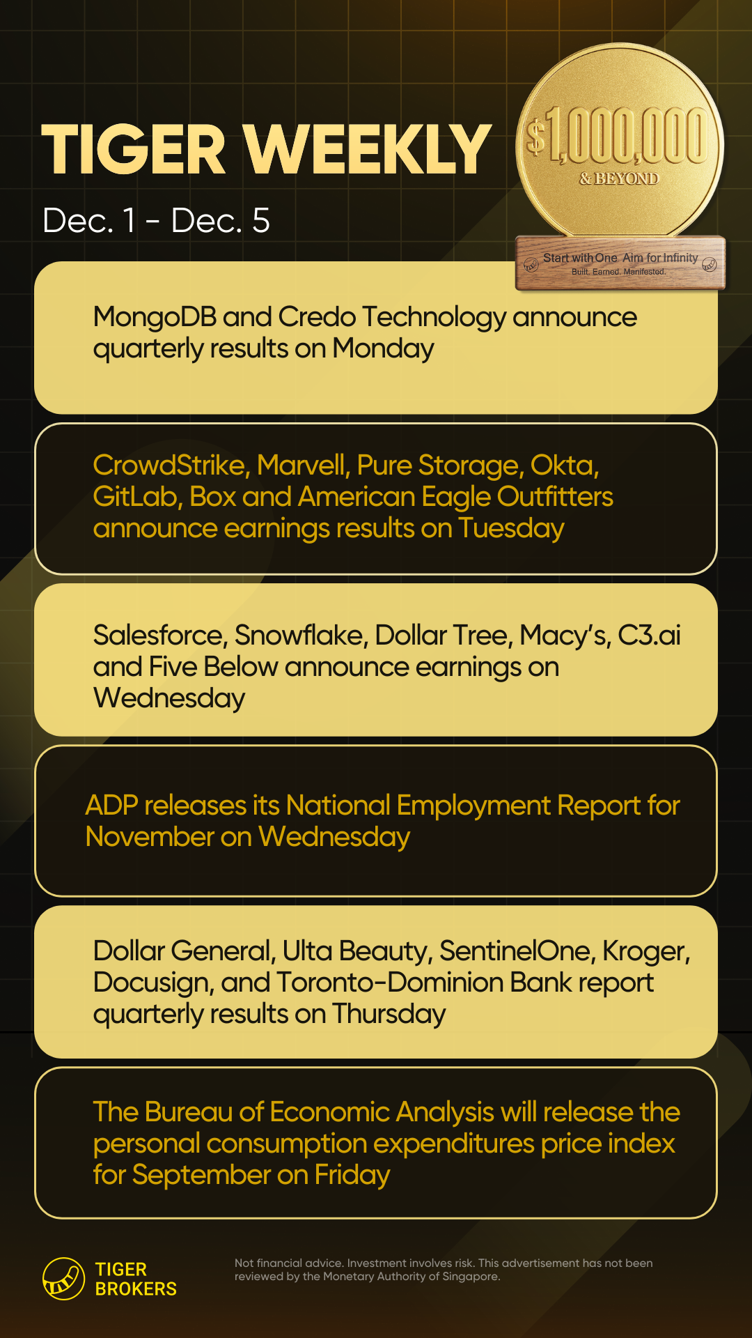关键财报包括 $MongoDB Inc.(MDB)$ 和 $Credo Technology Group Holding Ltd(CRDO)$ (周一),随后是 $CrowdStrike Holdings, Inc.(CRWD)$ 、 $丰业银行(BNS)$ 、 $迈威尔科技(MRVL)$ 、 $Pure Storage Inc(PSTG)$ 、 $Okta Inc.(OKTA)$ 、$GitLab, Inc.(GTLB)$ 、 $Box Inc(BOX)$ 、 $西格内特珠宝(SIG)$ 以及 $美鹰服饰(AEO)$(周二)。