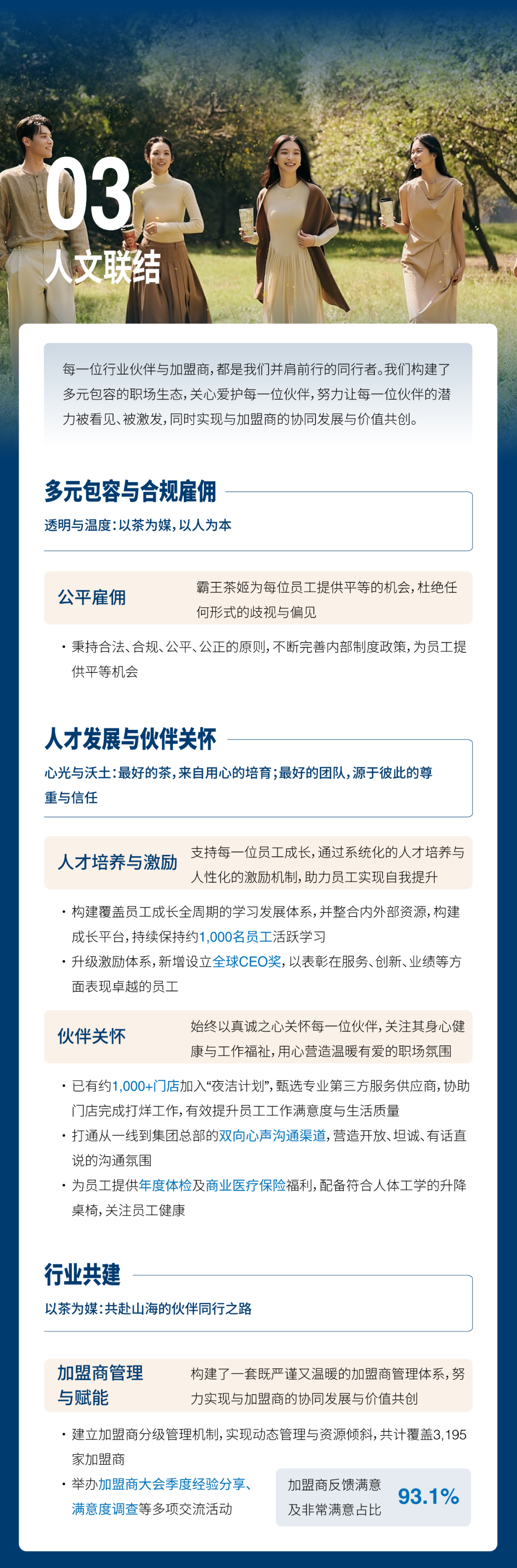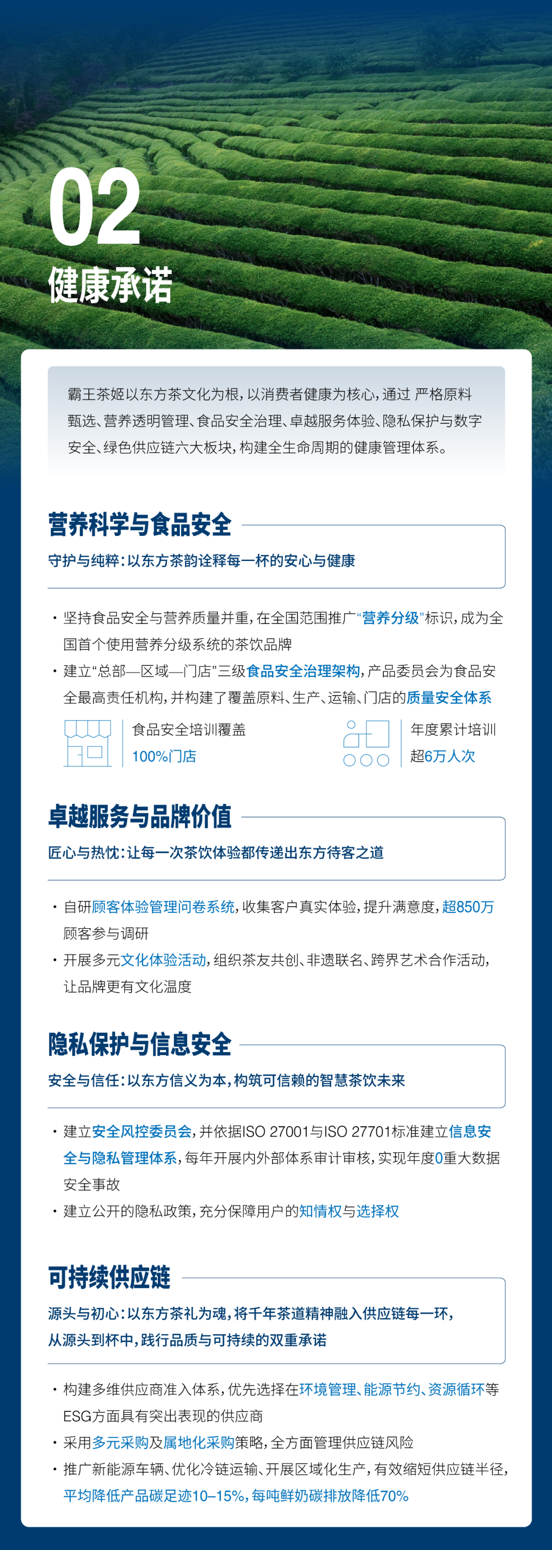 报告显示,霸王茶姬主要从文化传承、健康承诺、人文联结、生态守护、公司治理等五个方面着手,将可持续发展理念融入从茶园到茶杯的全产业链。同时,以一杯茶为纽带,串联起文化传承、产业共赢与生态守护等多个领域,实现商业、文化与环保等多重责任担当。