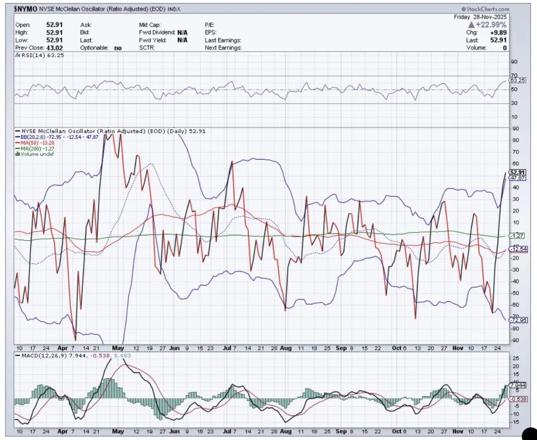 NYMO续涨,涨幅变小。 它连续几天推着布林上线上行, 需要一个回蹲,否则不到极值区就要回落。