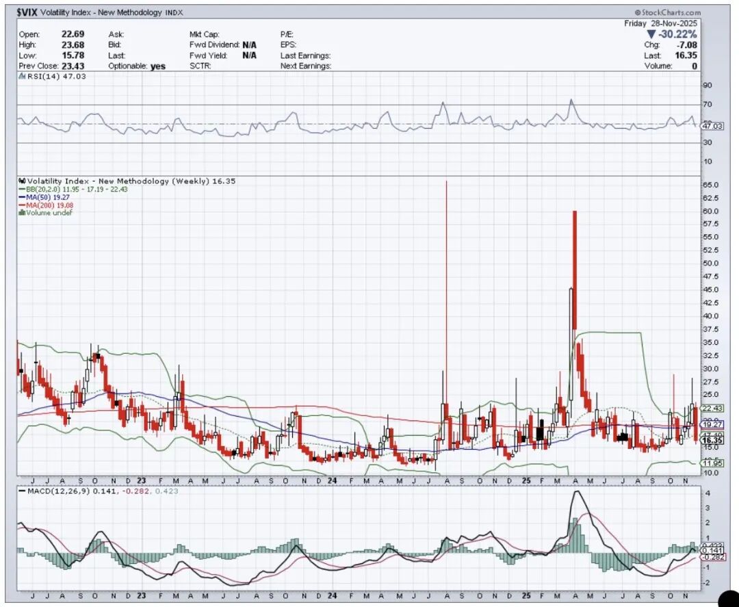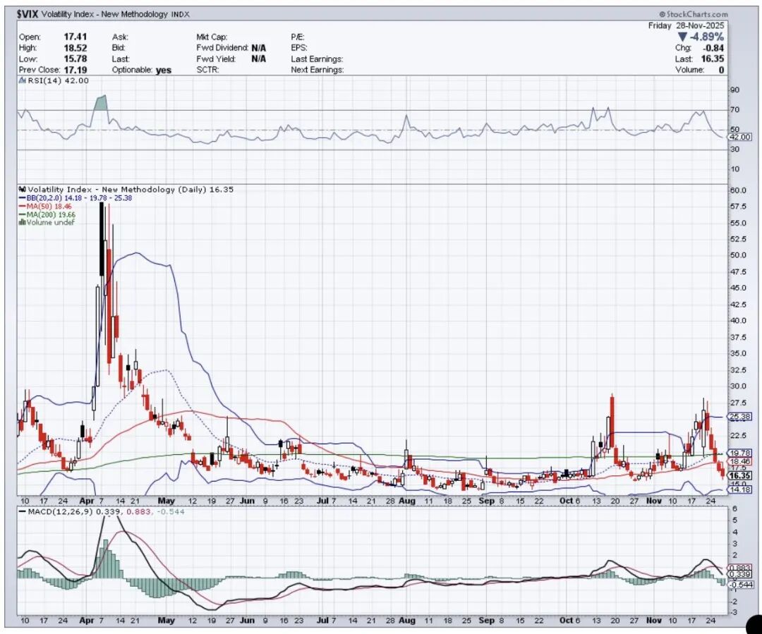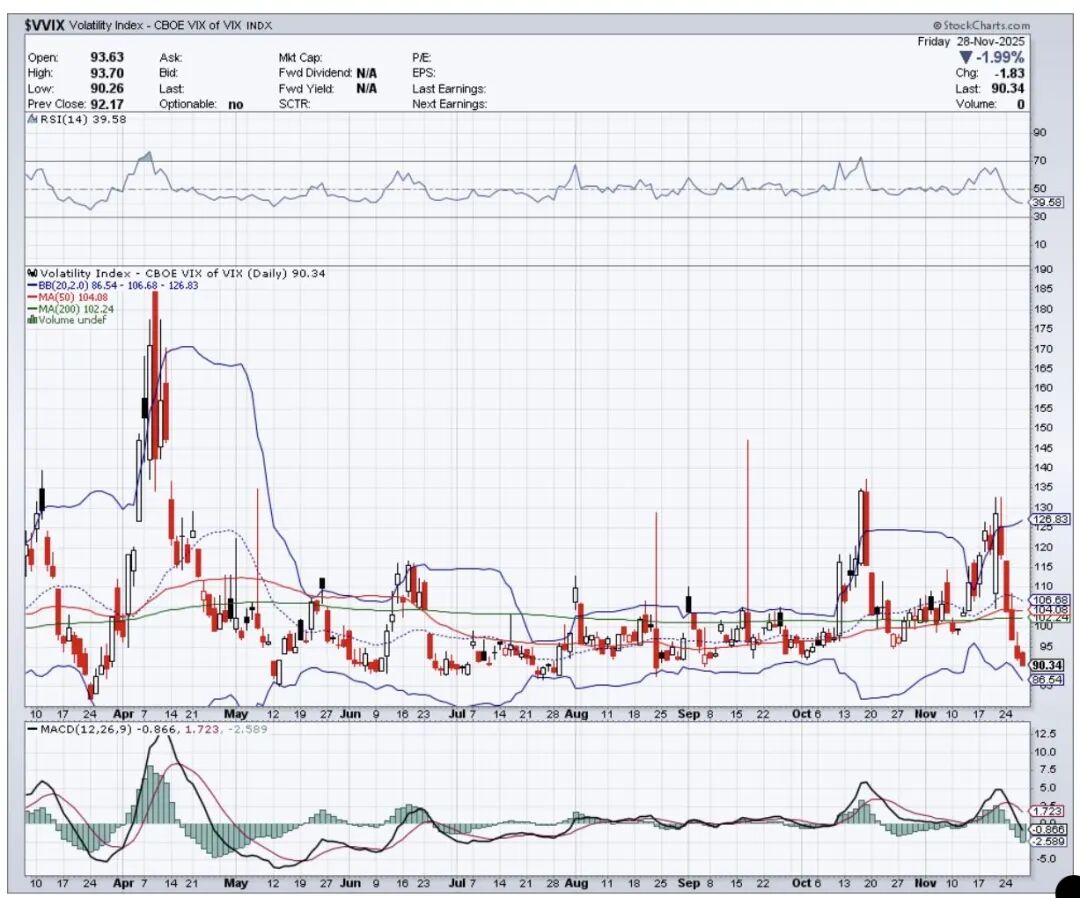 VVIX更弱:收阴收跌,出百日新低,逼近布林下线。要准备看它从头越了。
