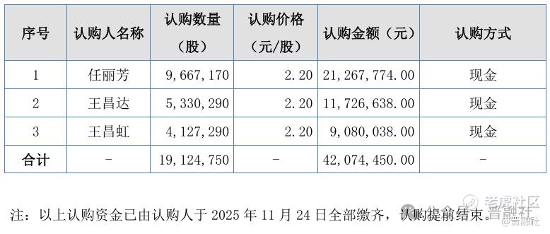 11月24日,山西晋龙养殖股份有限公司(简称“晋龙股份”)发布公告称,公司股票定向发行认购提前结束,定向发行的1912.48万股股份由实控人家族全额现金认购,4207.45万元募集资金已全部到账。