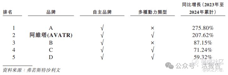 2024年,中国新豪华新能源乘用车市场的各品牌均处于快速发展阶段。按同比增长率计,阿维塔在新豪华新能源乘用车市场排名第二。