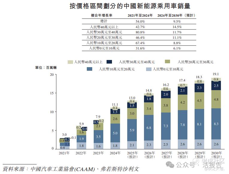 根据弗若斯特沙利文(Frost & Sullivan)的报告,2021年至2024年,中国新能源乘用车市场增长显著,复合年增长率为54.0%。于2024年,售价人民币200,000元至人民币300,000元、人民币300,000元至人民币400,000元及超过人民币400,000元的中国新能源乘用车分别占总销量的23.1%、11.8%及3.4%,合计达38.3%。到2030年,三个价格部分的份额预计将分别达到25.2%、13.3%及4.4%,合计达42.9%。于2024年至2030年,预期有关部分的复合年增长率将分别达到11.1%、11.7%及14.5%。