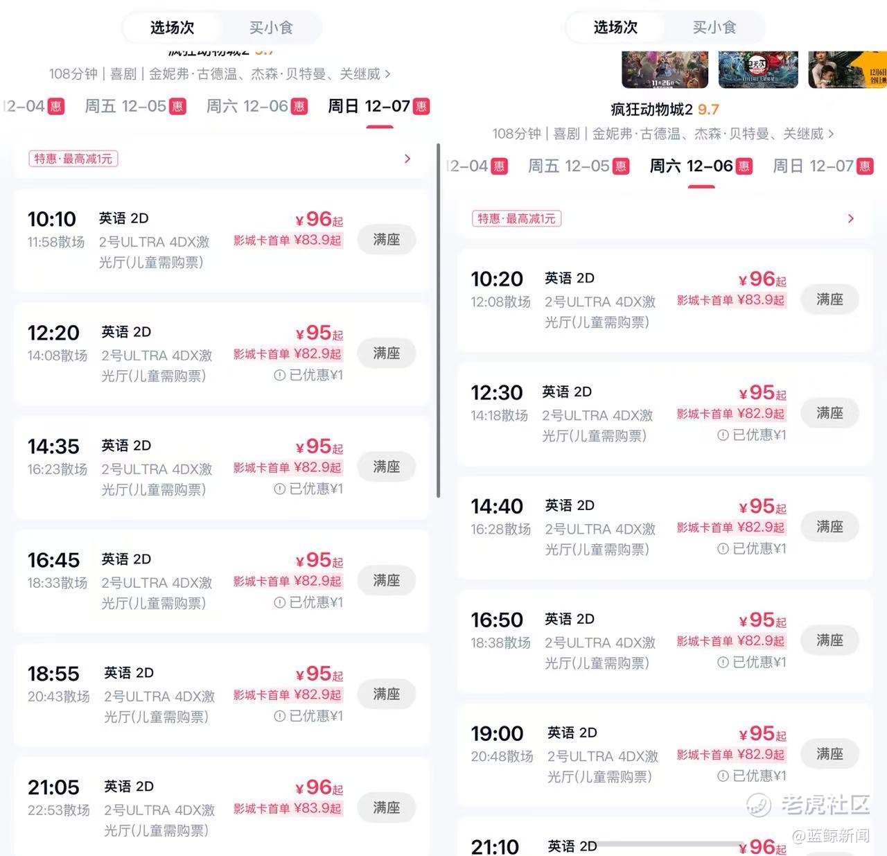 蓝鲸新闻记者查询发现,12月1日,《疯狂动物城2》占据78.1%排片的情况下,拥有91.2%的超高上座率。这一数据也在影院工作人员处得到佐证,一位上海某影院的工作人员告诉蓝鲸新闻记者,“最近真的是从早忙到晚,除了春节档那段时间很久没有这种感觉了”,该工作人员透露,目前影院基本上全天只排《疯狂动物城2》,“即便是工作日,很多场次的上座率都很高”。