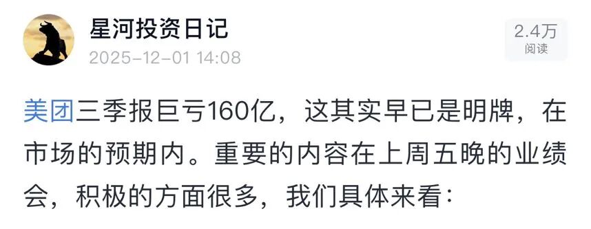 首先兴哥原话“外卖业务的亏损在三季度已经见底”,这是整个业绩会最有价值的一句话,可以说给市场吃了颗定心丸,未来公司会减亏、会扭亏,总之,财务层面最黑暗的时刻已经过去。