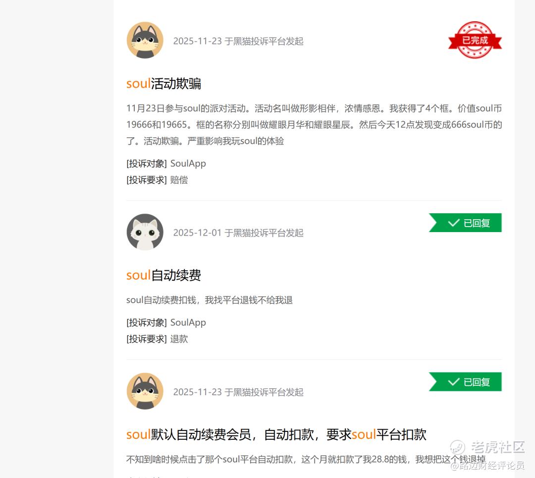 其二是消费投诉隐患。黑猫平台上,Soul相关投诉超5000条,多数聚焦充值消费问题:有用户参与 “形影相伴,浓情感恩” 活动获得的高价值Soul币道具被擅自贬值,也有用户遭遇默认自动续费、退款难等问题。这类投诉背后,或暗藏因营收压力导致的运营漏洞,不仅影响用户体验,更可能进一步拉低付费转化率与用户留存率。
