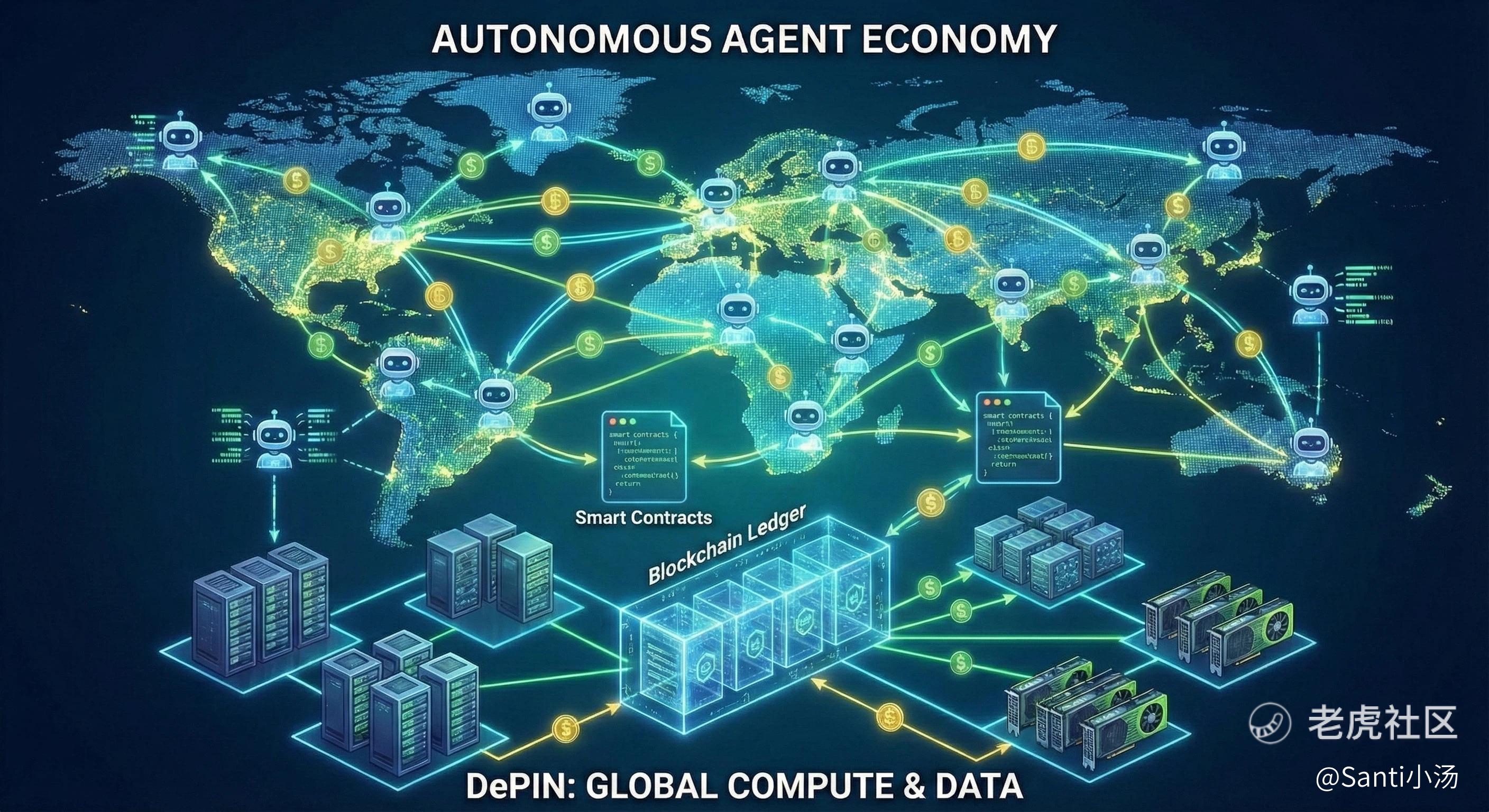 去中心化物理基础设施网络(DePIN)的协同: AI 的运行需要消耗大量的算力(GPU)与数据。通过 DePIN 网络(如 io.net, Render),AI Agent 可以直接租用全球闲置的个人或企业算力,并用 Token 实时结算。这一定程度上打破了中心化云服务商(AWS, Google Cloud)的垄断,降低了 AI 的运行成本,同时也为区块链提供了真实的效用场景(但项目方与参与方初始的算力来源,很可能还是来自最初的巨头,只是后续的租赁可以进行自主的选择来拆散绝对的垄断)。