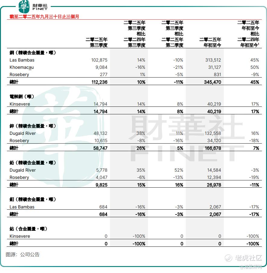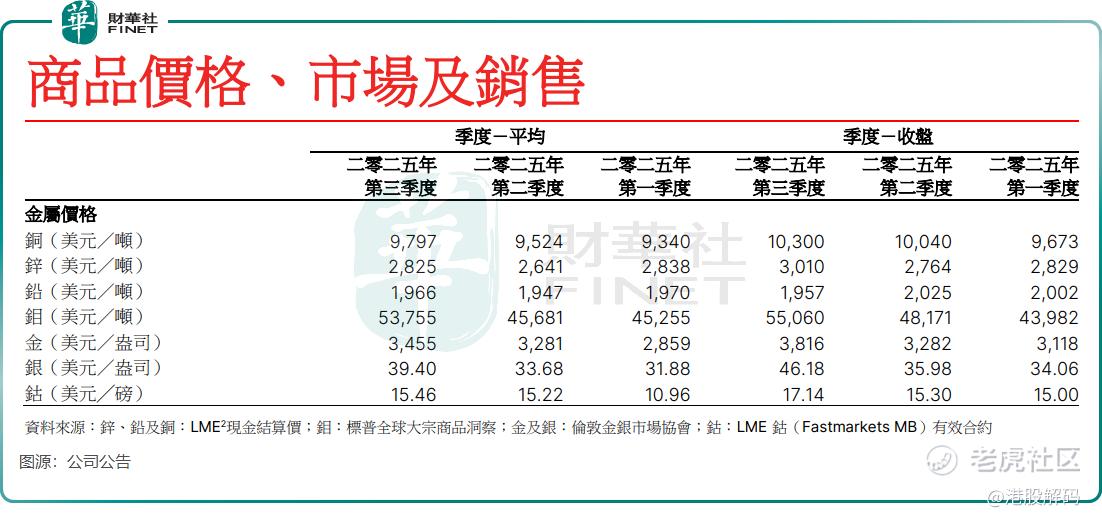 五矿资源生产端数据表现亮眼。据公司三季度生产报告显示,旗下矿山整体处于产能爬坡期,精准契合市场需求及贵金属价格上涨趋势。2025年第三季度,公司铜总产量(含铜精矿含铜及电解铜)达12.7万吨,同比增长11%;锌总产量5.87万吨,同比增幅高达26%。