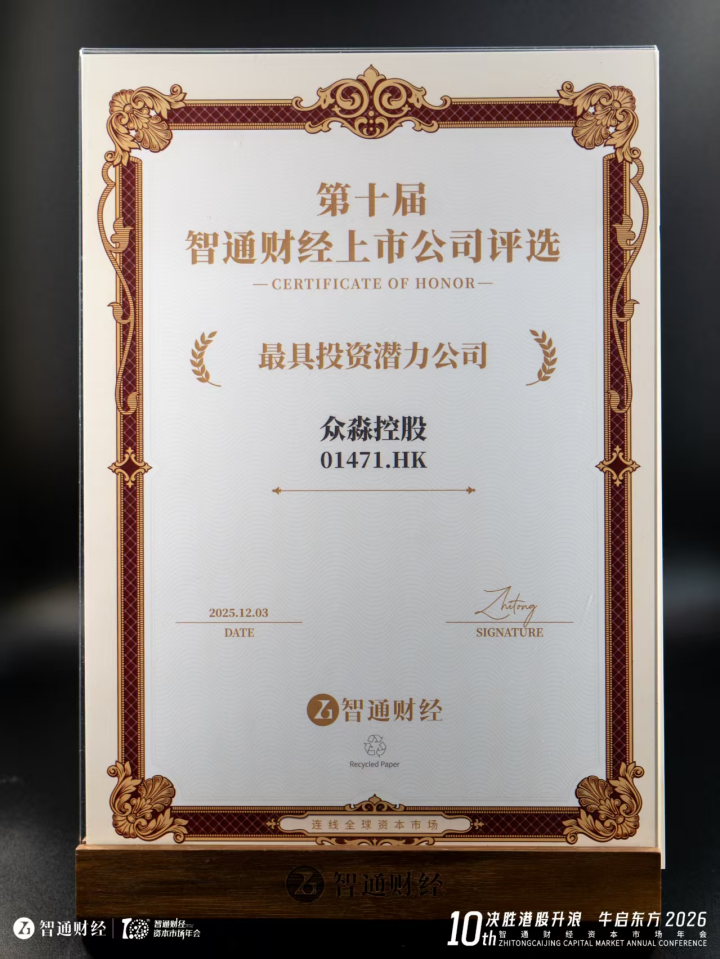 2025年12月3日,众淼控股(01471) $众淼控股(01471)$ 在备受瞩目的“第十届智通财经资本市场年会暨上市公司颁奖典礼”上,成功斩获“最具投资潜力公司”大奖。