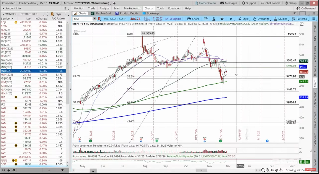 微软当前结构仍属于高位震荡,短期虽不排除补缺口回踩,但整体仍为多头趋势中修正。由于当前估值较高,年底连续创高的可能性有限,操作上不宜激进使用杠杆,更适合采取卖出期权等方式降低成本,维持长线布局思路。