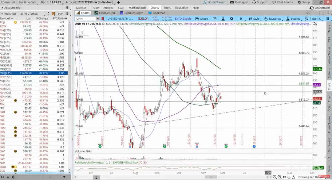 由于UNH冲高翻转并破坏均线支撑,显著拖累年底结算表现,故周一选择止损离场。短期不确定性高,资金效率不佳,将仓位转向更强势或更具确定性的标的更合理。