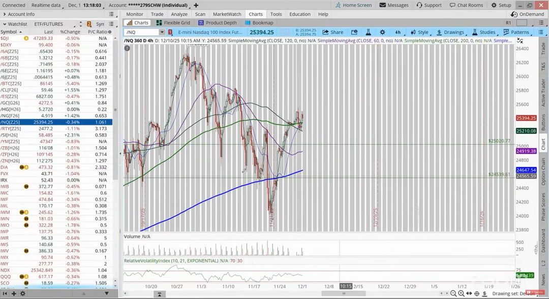 周一大盘出现12月首跌,市场对方向存在明显分歧。从周线到四小时周期整体呈现调整迹象,短期不再将其视为简单回踩买点,而是要尊重新的下跌尝试。主要风险来自12月可能的加息扰动,使得市场在年底结算前不愿意冒险,因此震荡偏弱几率更高。指数虽未出现恐慌杀跌,但技术位置被破坏后,上攻难度大于下行风险,当前策略应更关注仓位管理与防守。