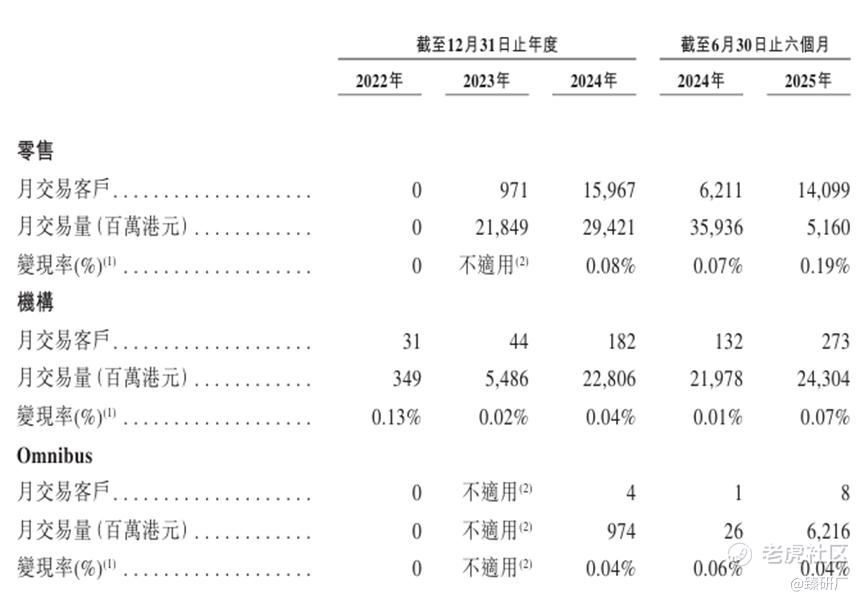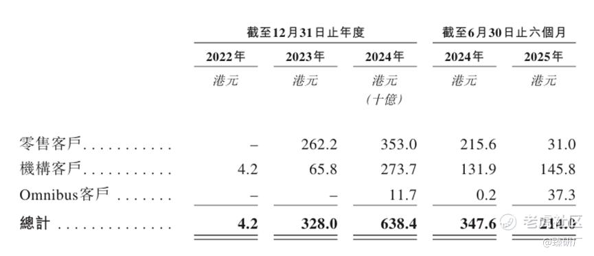 HashKey的客户主要包括机构客户(银行、资产管理公司、家族办公室、对冲基金及Web3开发者)、Omnibus客户(持牌证券公司)、生态系统合作伙伴(Coin.ph、胜利券商、华检医疗、中国新城市集团、广发证券、渣打银行、众安银行)和零售客户。2022年至2025年上半年前五大客户收入占比分别为79.6%、56.0%、18.5%、22.8%,最大客户收入占比分别为52.8%、40.1%、10.6%、12.3%。