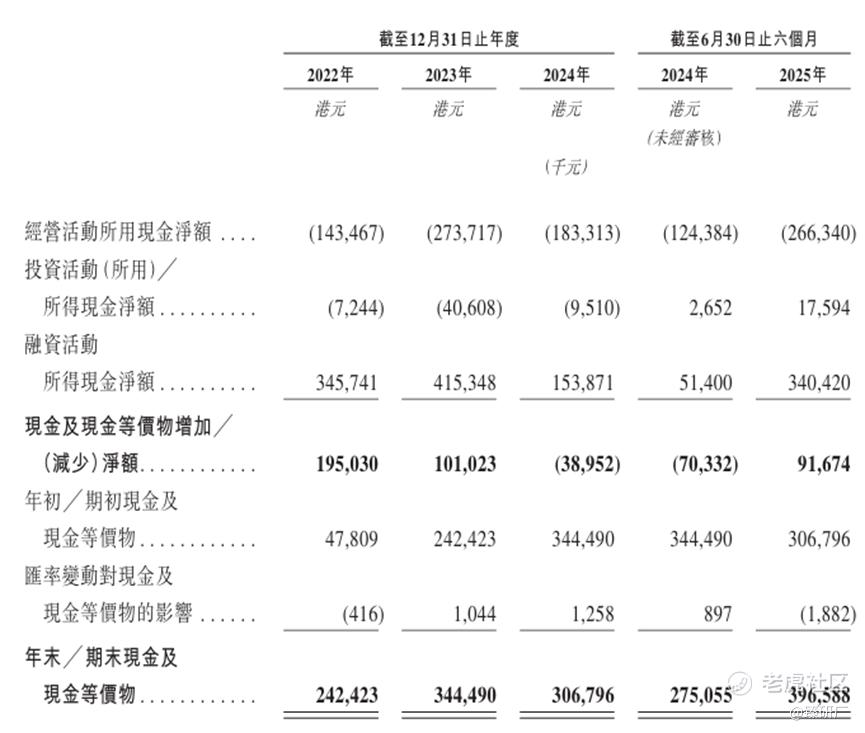 2022年至2025年H1,公司经营性现金流分别为-1.43亿港元、-2.74亿港元、-1.83亿港元、-2.66亿港元,持续为负,尚未形成自主造血能力,日常运营主要依靠融资补血。截至225年9月30日,经营性现金流出净额为1.23亿港元,相当于每月0.41亿港元。截至2025年8月31日,公司期末现金及现金等价物有16.57亿港元,以及总值5.92亿港元的数字资产(84%为ETH、BTC、USDC、USDT、SOL的主流资产,流动性较强)。按每月0.41亿港元的现金消耗规模来看,公司拥有充足的资金支撑未来约40个月的运营。截至2025年H1流动负债净额为-17.92亿港元,流动性不足,短期偿债压力较大,迫切需要上市融资输血。