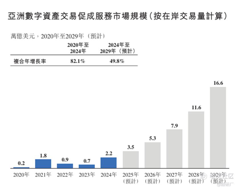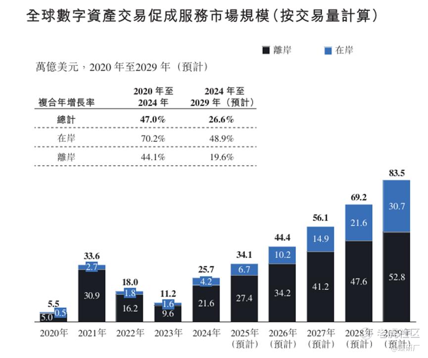 全球数字资产交易促成服务市场机会迅速增长,以单边交易量计算的全球数字资产交易促成服务市场规模,已从2020年的5.5万亿美元增长至2024年的25.7万亿美元,复合年增长率为47.0%。在经历了2021年的牛市之后,全球数字资产交易量于2022年及2023年显著下降,主要由一系列离岸服务提供商(尤其是FTX)的崩盘事件引发,削弱了当时投资者信心,并最终导致数字资产价格暴跌。例如,比特币的价格由2021年末的逾60,000美元跌至2022年中的低于20,000美元,侵蚀了投资者的未变现收益并削弱了整体交易热度。此外,美国和欧洲等主要市场加强监管亦为交易所及托管商带来合规方面的不确定性,阻碍了做市活动并限制了机构参与。展望未来,全球数字资产交易促成市场的规模预计将以26.6%的复合年增长率持续扩张至2029年的83.5万亿美元。