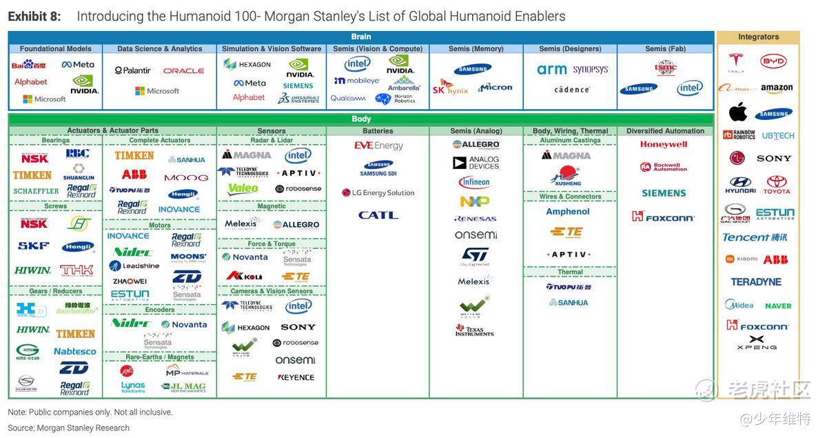 围绕特斯拉展开的一圈企业,包括动作模型、视觉模型、推理加速、边缘算力等方向,也是 Morgan Stanley 在《Humanoid 100》中归类为“机器人大脑(Brain)”的部分,例如英伟达、AMD、索尼、谷歌、英飞凌等。