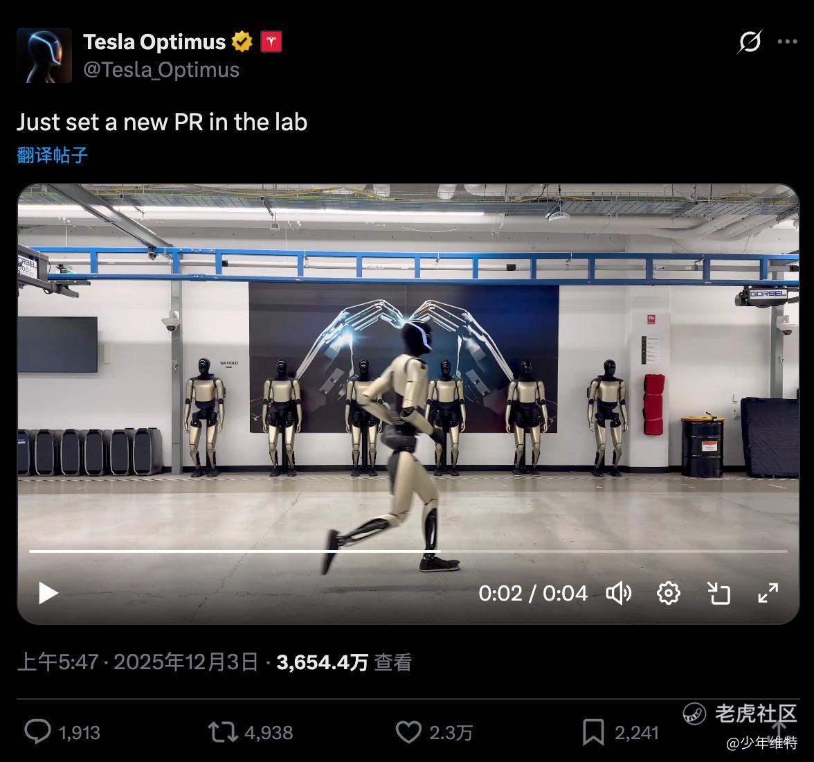 真正值得盯的还是特斯拉。12月初,特斯拉官方账号又在 X 上放出 Optimus 在实验室小跑的视频,机器人在实验室里稳稳地跑步,背景是一墙已经量产出来、整齐插着电的 Optimus,发文配的就是“刚在实验室刷了新纪录”这句。