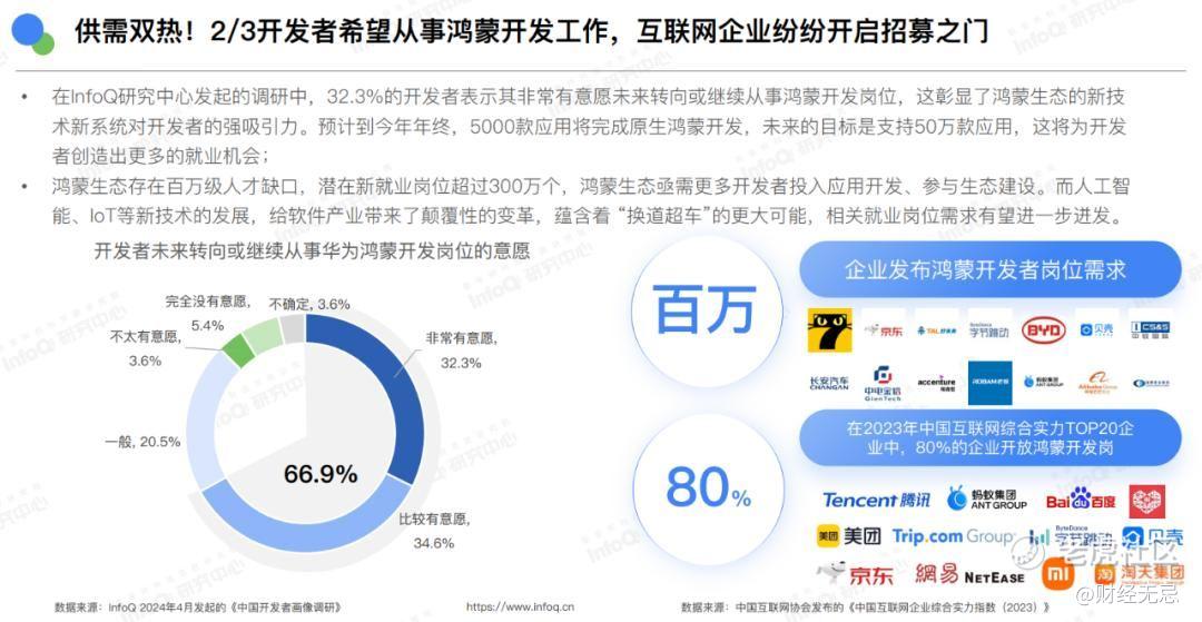 InfoQ研究中心发布的《中国开发者画像洞察研究报告2024》就显示,目前,鸿蒙生态已催生出超过300万个潜在就业岗位,2024年鸿蒙开发者平均薪资涨幅达43.1%,远超安卓22.7%。