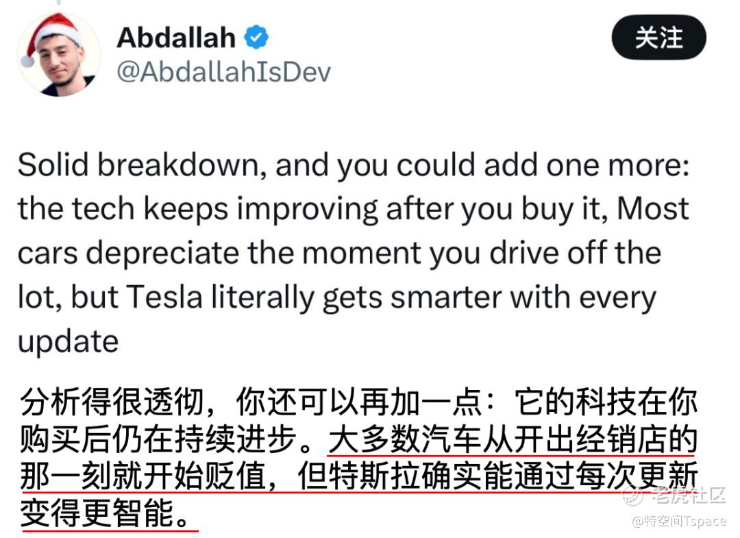 海外博主@AbdallahIsDev 表示:“传统乘用车从开出经销店就开始贬值,而特斯拉却能做到每次远程软件升级都能让车变得更智能。”