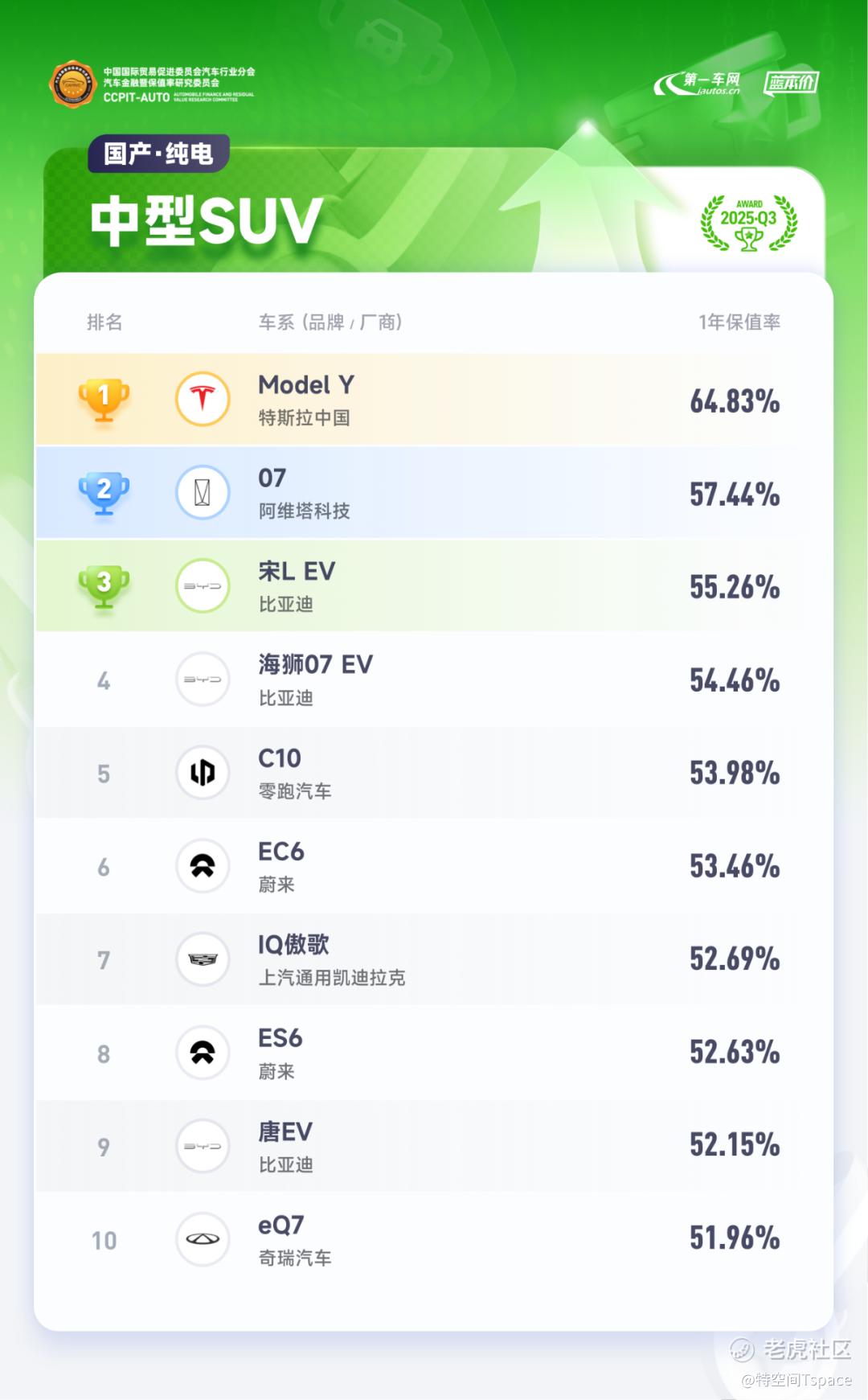 在CCPIT-AUTO(中国国际贸易促进委员会汽车行业分会)与蓝本价联合发布的《2025年第三季度中国汽车保值率排行榜》中,特斯拉Model 3/Y便已在各自细分市场稳居第一,分别成为最保值的国产纯电中型轿车与纯电中型SUV,其1年保值率远超多款热门新能源车型。
