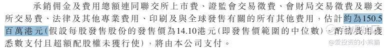 然后这个票招股书上按发售价的中位数14.10港元计算,公开的上市所有开支总额约为1.51亿港元,募资额约29.78亿港元,占比约5.05%,开支相比募资额算是比较少了。