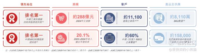 在客户与供应链布局上,京东工业优势显著:截至2025年6月30日前十二个月,服务超1.11万家重点企业客户,2025年上半年合作客户涵盖约60%中国《财富》500强及超40%在华全球《财富》500强企业;同期其工业品SKU达8110万个、覆盖80个品类,供应网络由15.8万家制造商、分销商及代理商组成,具备行业领先的商品覆盖与供应能力。