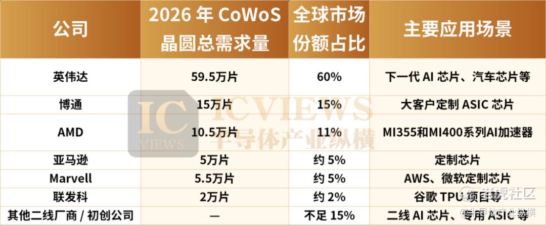 AMD预计将获得10.5万片CoWoS晶圆,占据约11%的市场份额。其中,8万片将在台积电生产,用于其MI355和MI400系列AI加速器。