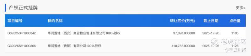 《星岛》从上海联合产权交易所官网了解到,11月30日,华润置地(西安)商业物业管理有限公司(下称“华润西安”)100%股权、华润置地(贵阳)有限公司(下称“华润贵阳”)100%股权分别被挂牌转让,转让底价分别约为9.7亿元、11.08亿元,截止日期均为2025年12月26日。