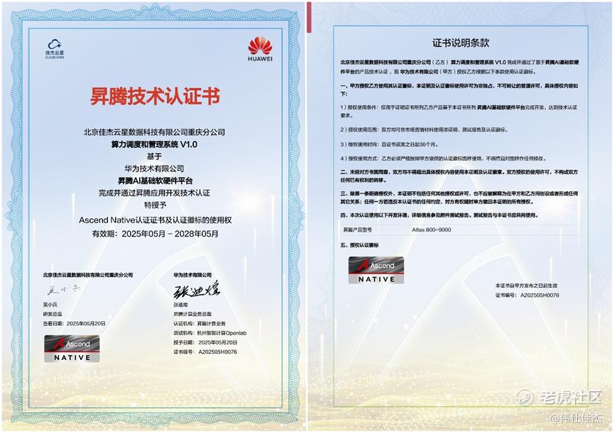 作为业界领先的企业级智算算力调度和管理软件和服务提供商,佳杰云星自2022年起与**进行深度合作,入驻**社区合作伙伴中心,并加入鲲鹏展翅、**万里合作伙伴计划。目前,佳杰云星已全面融入**计算产业生态,完成算力调度和管理系统方案对Atlas 800-9000产品的适配,被授予Ascend Native认证证书。