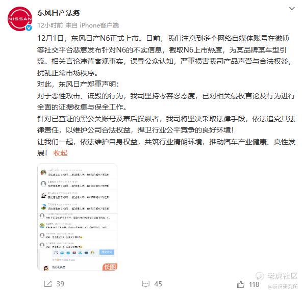 东风日产N6上市,日产法务部称多个账号集中发布不实言论截取N6的上市热度,为某品牌特定车型引流