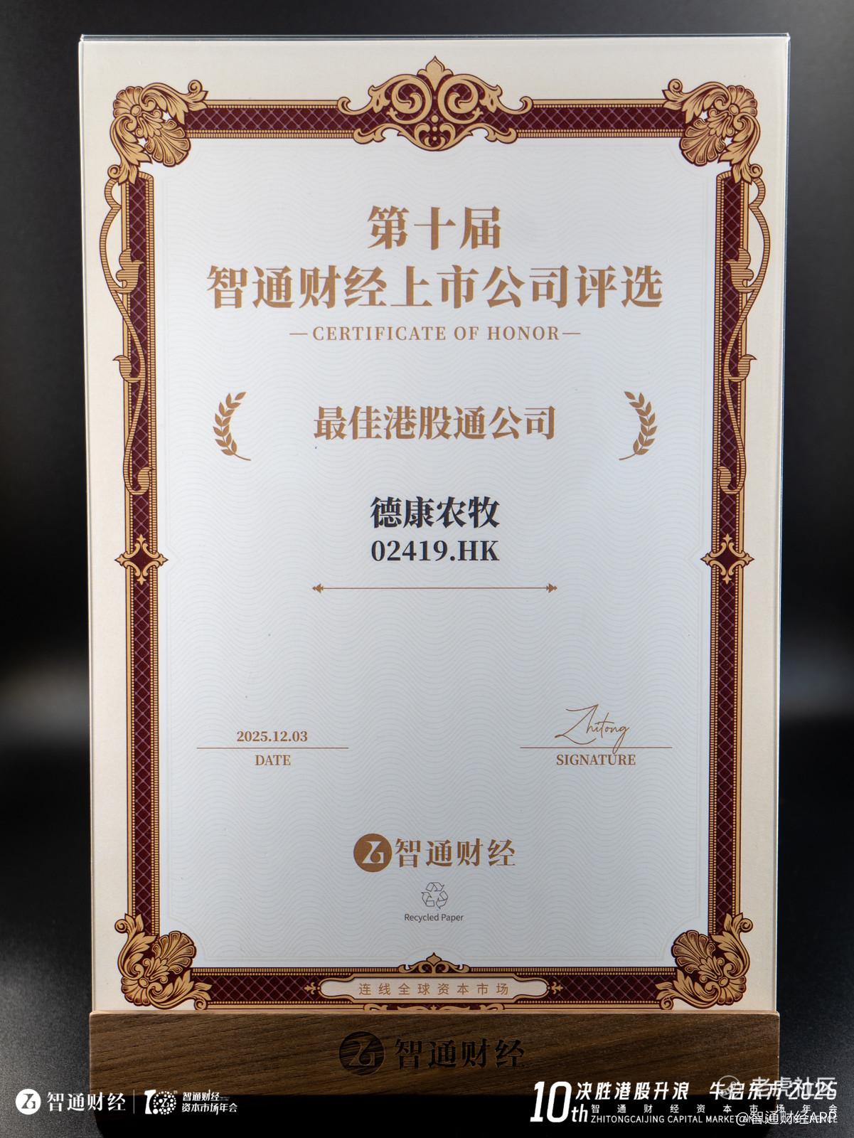 在“第十届智通财经上市公司颁奖盛典”上,德康农牧(02419) $德康农牧(02419)$ 获评“最佳港股通公司”大奖。自2016年智通财经首次举办上市公司评选活动以来,行至第十届,现已成为港美股领域最具规模与影响力的年度盛事。作为国内全产业链畜禽养殖龙头企业,德康农牧凭借其领先的行业地位、扎实的公司治理、稳健的经营基本面以及持续的投资者回报,首次夺得这一深具含金量的荣誉,充分彰显了资本市场对其长期价值与成长韧性的高度认可。