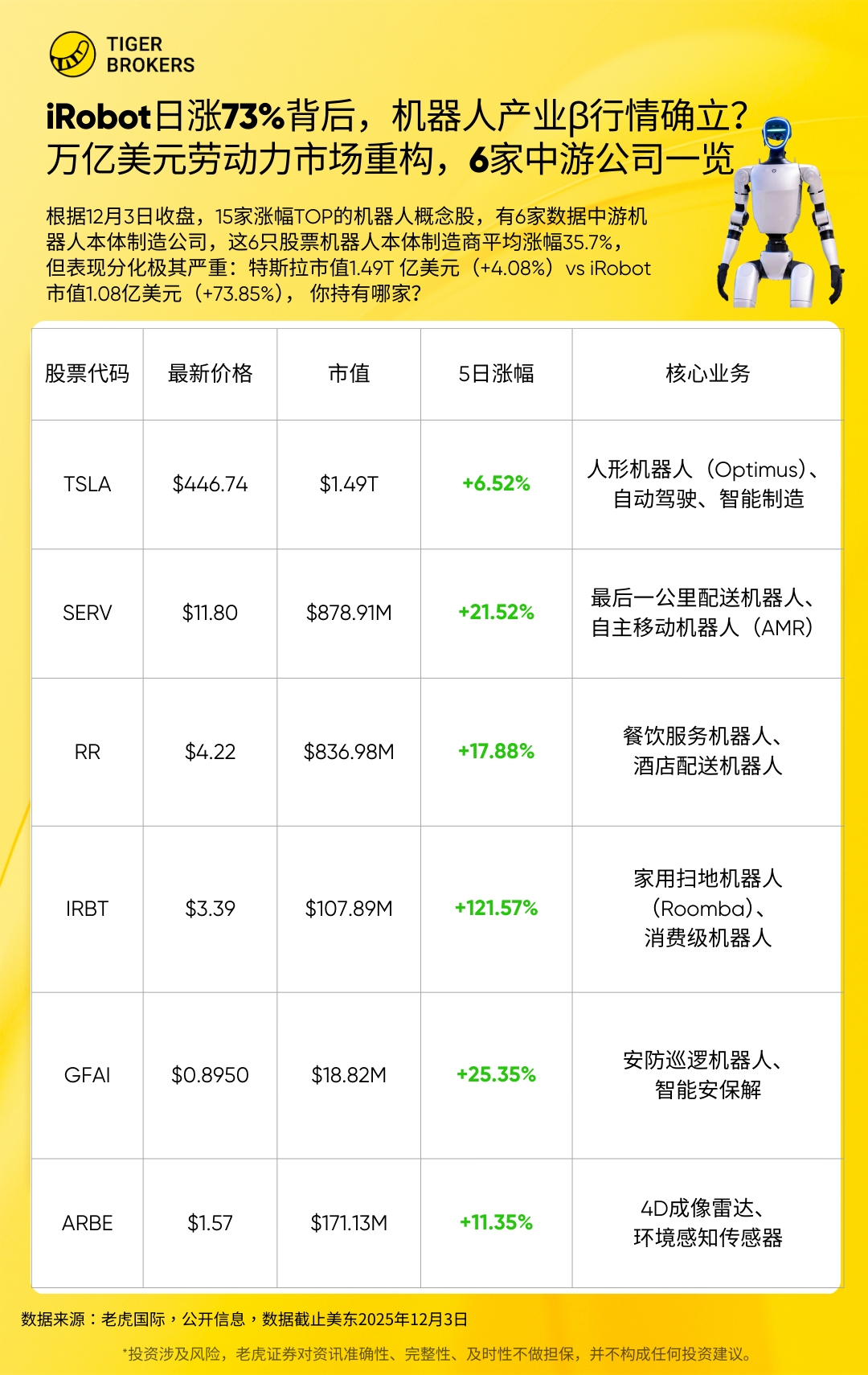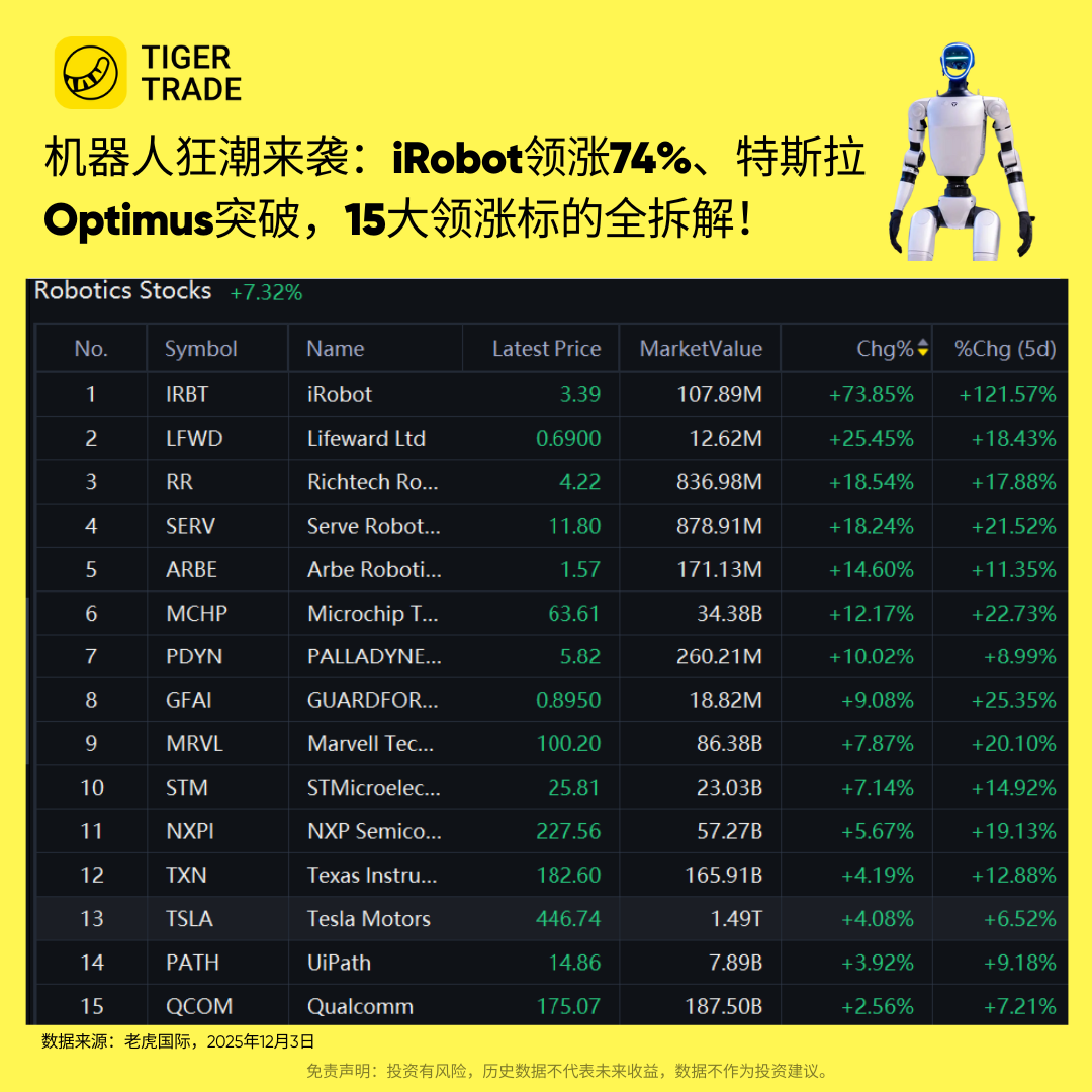 🚀机器人狂潮来袭:iRobot领涨74%、特斯拉Optimus突破,15大领涨标的全拆解