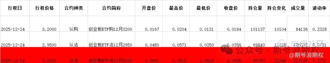 (3)创业板ETF期权:12月最大持仓范围3000-3100,今收3.051,上涨1.06%。期权12月合约,认购和认沽都以增仓为主。认购增仓集中在2850-3700,合计4.0W张;认沽增仓集中在2650-3200,合计6.7W张。市场偏乐观,但也有谨慎。变化超过1W张的仓位如下,红色是增仓较大的。