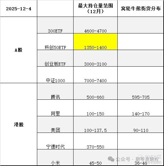 下图是今天大A的3个ETF和中证1000,以及港股的腾讯、阿里、美团、宁德和小米的最大持仓量范围以及窝轮牛熊分布范围,也就是12月的期权筹码分布,黄色的表示跟上个交易日有变动。