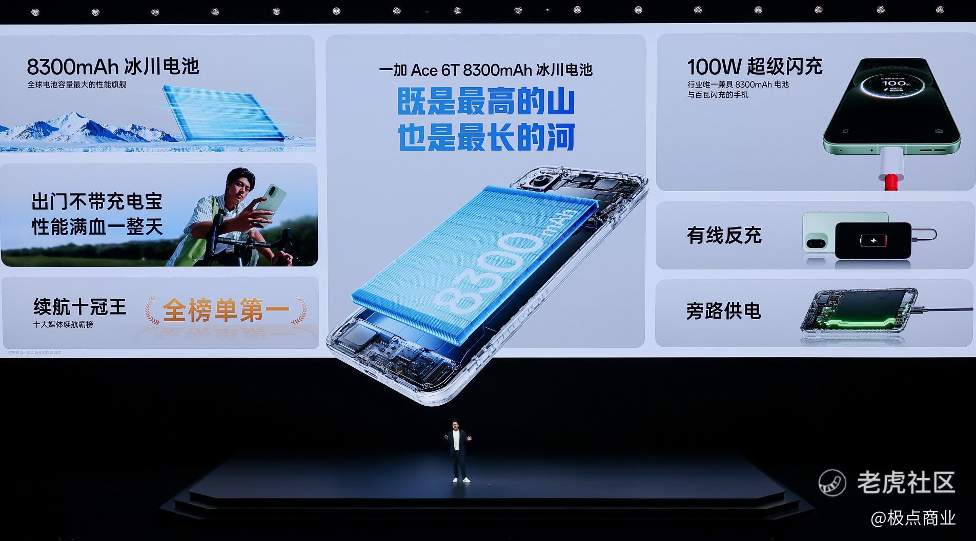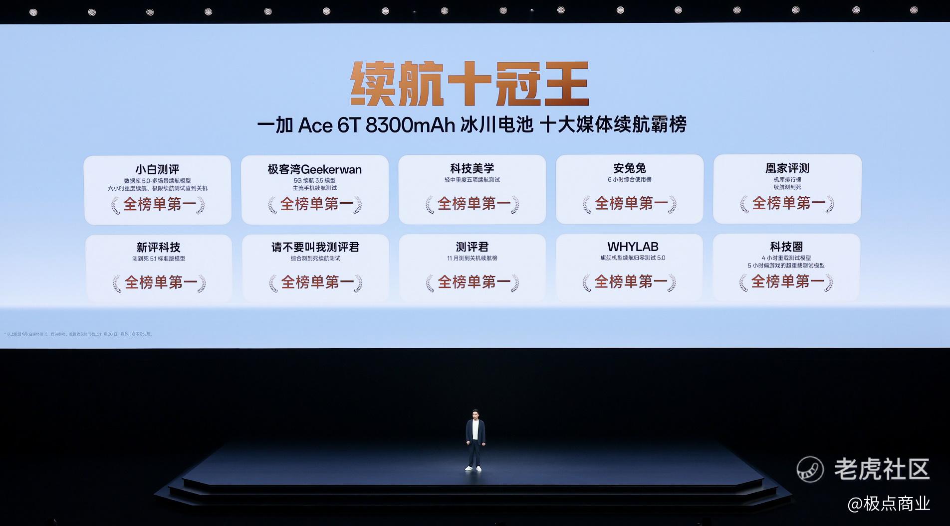 一加 Ace 6T配备8300mAh 超巨量冰川电池,支持100W超级闪充,是行业中唯一兼具8300mAh 电池和百瓦闪充的机型,续航实力异常强悍,霸榜10大专业科技媒体续航实测榜单榜首,成为当之无愧的“续航十冠王”。