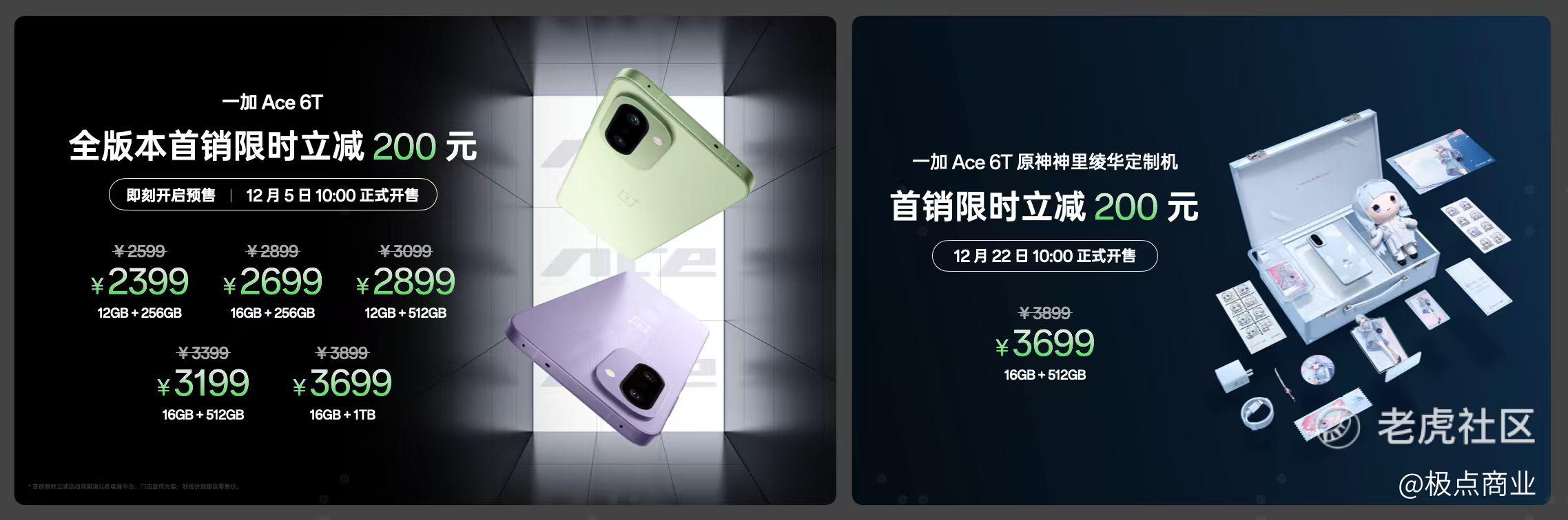 一加 Ace 6T 将于 12 月 5 日 10:00 正式开售,一加 Ace 6T原神神里绫华定制机将于 12 月 22 日 10:00 正式开售。新品开售后将登陆 OPPO 商城、京东、天猫、拼多多、抖音等平台,首批购机用户可享受以旧换新购机补贴等丰富福利。