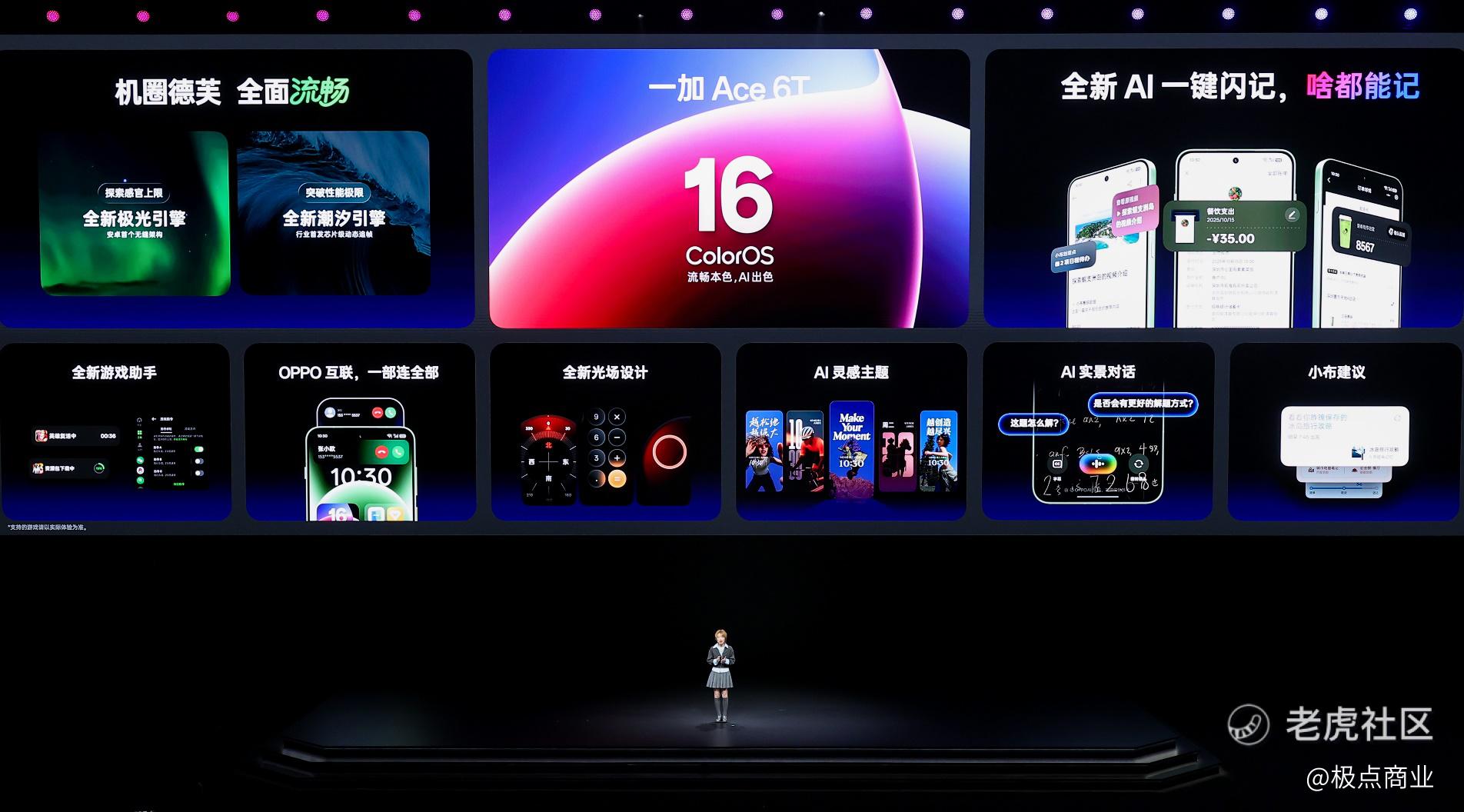 一加 Ace 6T搭载全面焕新的 ColorOS 16,全面流畅,堪称机圈德芙。一加 Ace 6T搭载的全新潮汐引擎和全新极光引擎,支持全场景操控持久丝滑。一加 Ace 6T的AI能力也持续进化,新增「AI一键闪记」、AI实景对话等功能,适配学习生活丰富场景。一加Ace 6T 还带来非常实用的游戏助手功能,游戏流体云能够实时查看游戏进度,全新的 AI 游戏指令提前录入游戏操作,更有定向屏蔽应用消息、召唤师技能倒计时、游戏启动动画加速以及游戏多窗等功能,加持用户游戏体验。此外,一加 Ace 6T可实现与iPhone等设备的无缝连接,支持屏幕镜像、来电接听与通知同步、健康数据同步等贴心功能,为用户打造高效跨设备工作流。