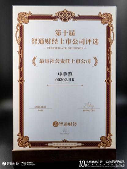 第十届智通财经上市公司评选,中手游荣获“最具社会责任上市公司奖”