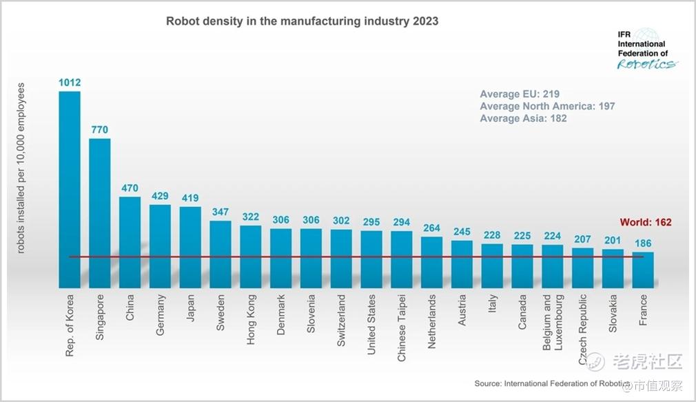 根据国际机器人联合会(IFR)之前的一份报告,中国每万名员工大约有470台机器人,远远低于韩国的1012台和新加坡的770台。