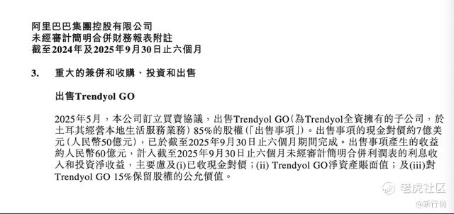 公告指出,该出售事项产生的收益约人民币60亿元,计入截至2025年9月30日止六个月未经审计简明合并利润表的利息收入和投资净收益,主要虑及:已收现金对价,Trendyol GO净资产账面值及对Trendyol GO 15%保留股权的公允价值。